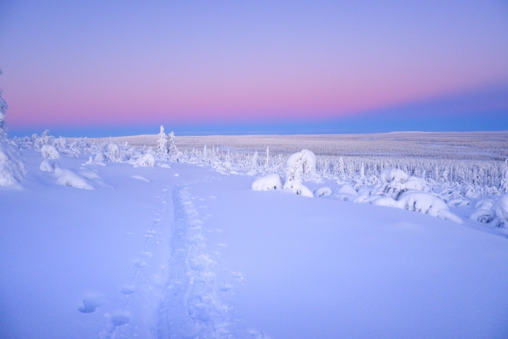 /0 Comments/in Nature experience, Seasonal highlights/by Jonna Saariラップランドでの真冬の丘陵ハイキング中、天気が良ければ、沈む太陽とは反対側の風景に、鮮やかで美しい色彩が見られることがあります。上部に見えるクールトーンの赤みは「ビーナスの帯」または「反薄明光線」と呼ばれます——つまり、日没の反対側に昇る残照です。その下には、特定の条件下で、非現実的なほど美しい青さを見分けることができます。これは、私たちの故郷である地球の影です。