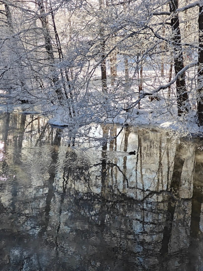 公園に立つ大きく多様な木々や美しい建物、彫像はすべて雪に覆われていました。澄みきった真昼の光が差し込む凍てつくその日、時間が止まってしまったかのように感じられました。水面に浮かぶスイレンの小道も凍りつき、密かに氷穴を期待していた遊泳場も完全に結氷していましたが、対岸へと続く橋の近くには水面が開いている場所が見えました。