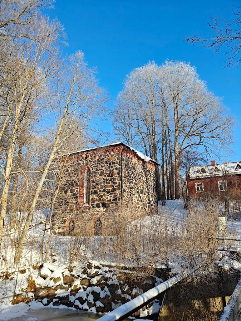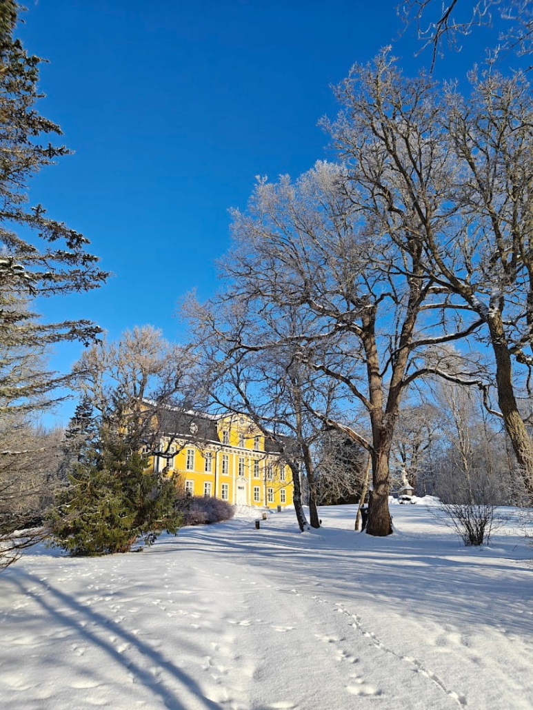 フィンランドでも特に価値の高い邸宅建築のひとつである黄色いムスティオ邸は、青と白に包まれた冬景色の中で、陽だまりのような柔らかな色合いに輝いていました。この邸宅には数多くの怪談が伝えられていると聞いていたため、窓の奥から中庭の私たちの動きを幽霊たちが見つめているのではないかと、思わず想像してしまいました。いつかここに宿泊して、本当に幽霊の存在を信じるようになるのか試してみるのも面白そうです。開館時間は公式ウェブサイトでご確認いただけます。