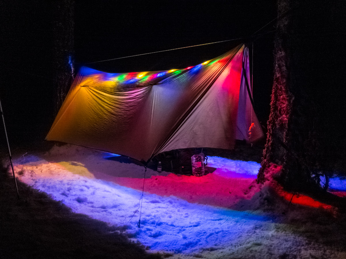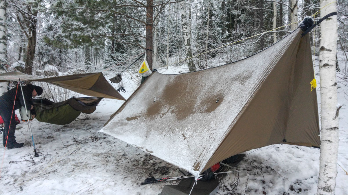 The tarp is a Warbonnet Super Fly, which has 2000 mm water barrier. It is 335 cm long and 305 cm wide. Both ends have doors, which can be closed to get more cover from the wind and rain. This tarp is designed to be used in the winter as well. It has pull outs on both sides to make more space inside. This tarp is very light, weighing around 500 grams. With the stakes and cords the total weight is 700 grams. This tarp is well made using good materials, but the pull outs need to be sealed with silicon etc, so that any water won’t drip inside.
