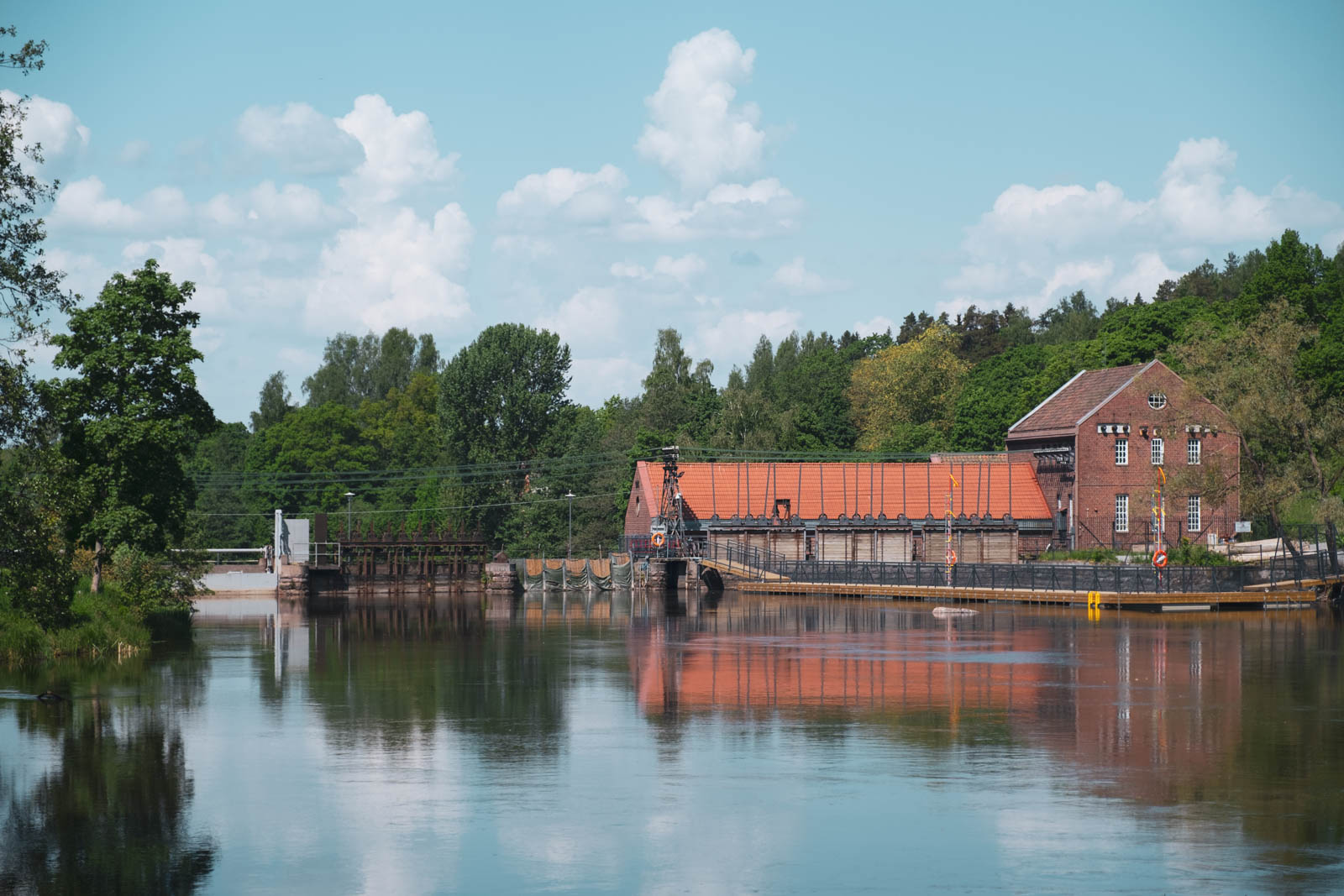 I pass the foundry on the slope, which dates back to 1836, and as I descend back to the river level, I see more red buildings on the opposite side of the water. Together with the river’s mirror-like surface, they paint a beautiful scene untouched by the teeth of our modern times.