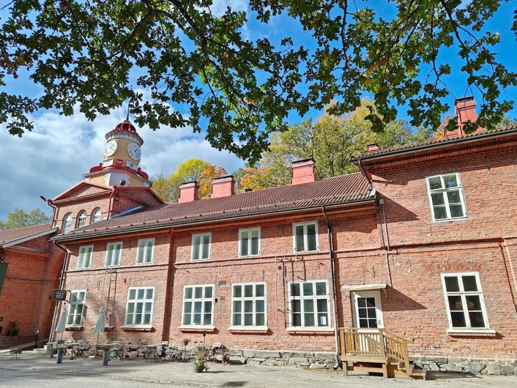 Opposite the plow workshop, the smaller yellow building is the office of the Fiskars Museum, formerly a canteen for workers. I walk uphill between the buildings, enjoying the wonderful October weather created by the autumn sun and wind, the fluffy clouds in the sky, and the silence. In the middle of the photo below, the yellow and red-roofed Fiskars Museum peeks out – a very beautiful building. The museum was established in 1949, but the building itself is an old office from the mid-1800s.