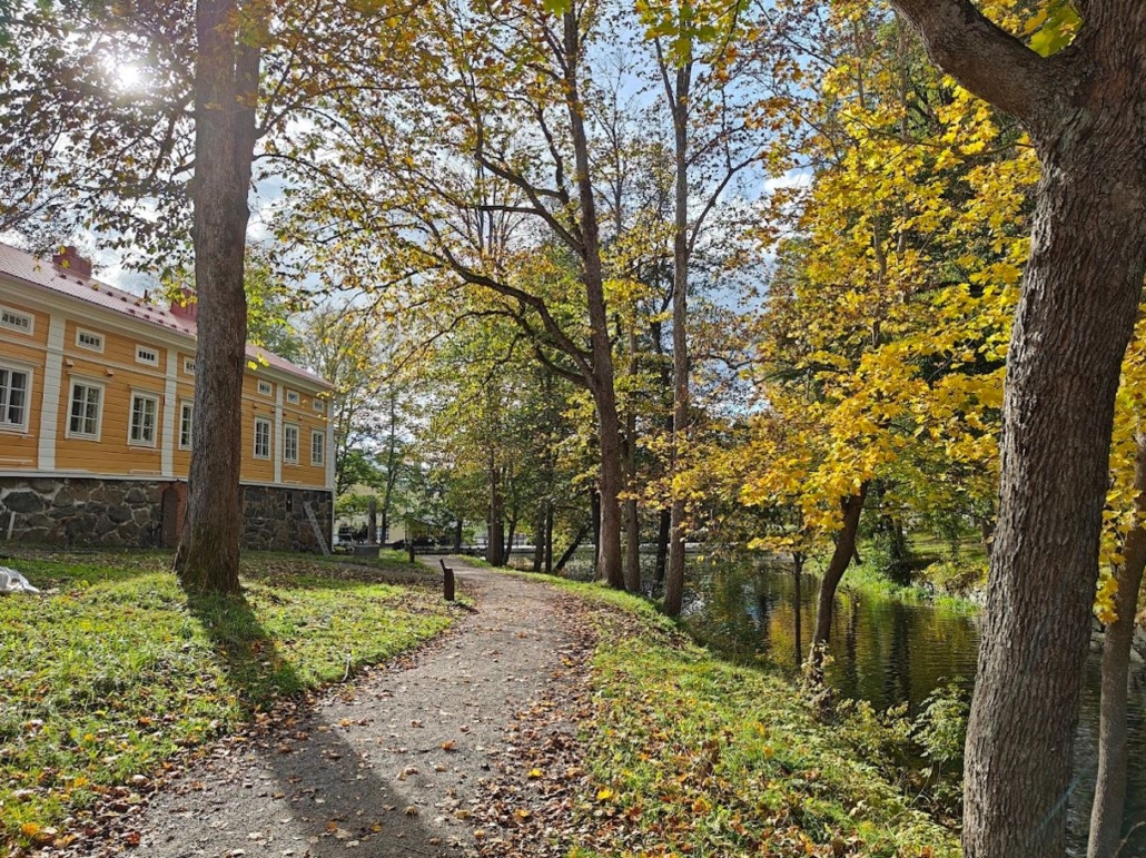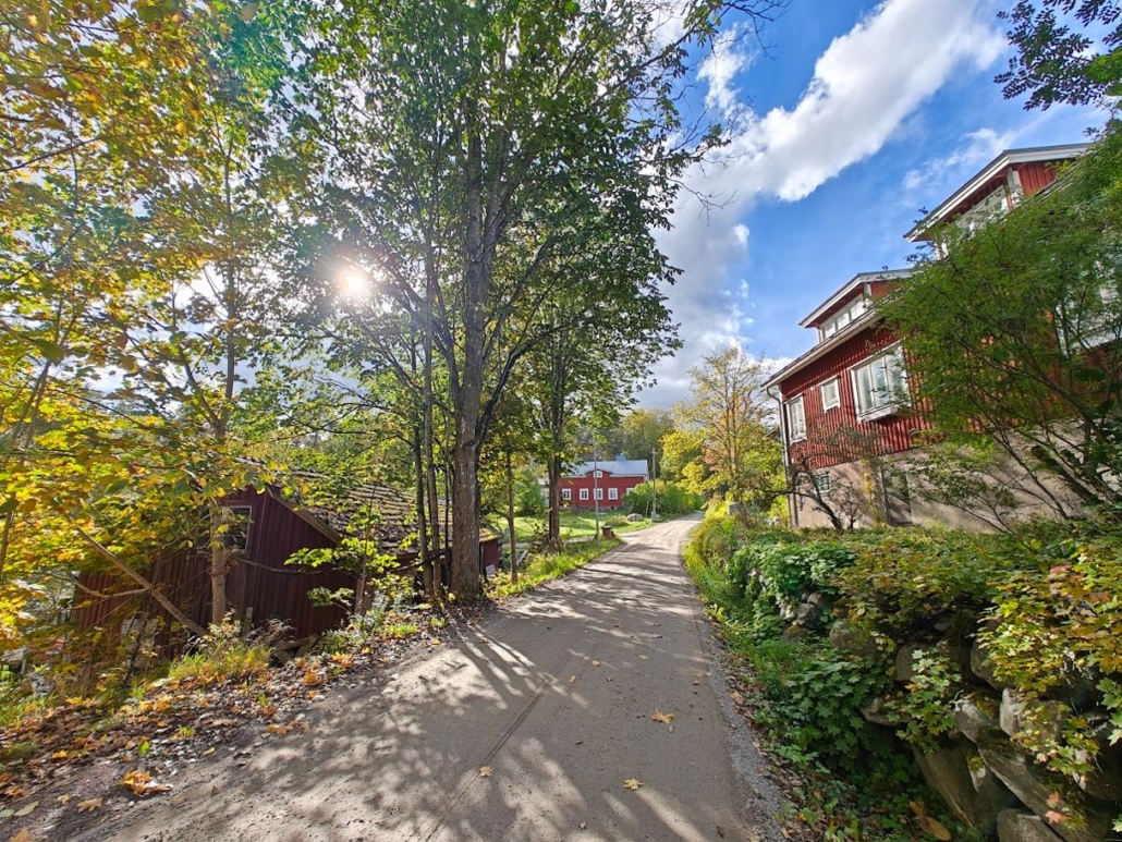 The river flows downwards, and I follow it. I admire the Ruukinkonttori house, bathing in the autumn sun along the main street, and decide to take a small detour further along Fiskarsintie road before heading up to the Tree species path.