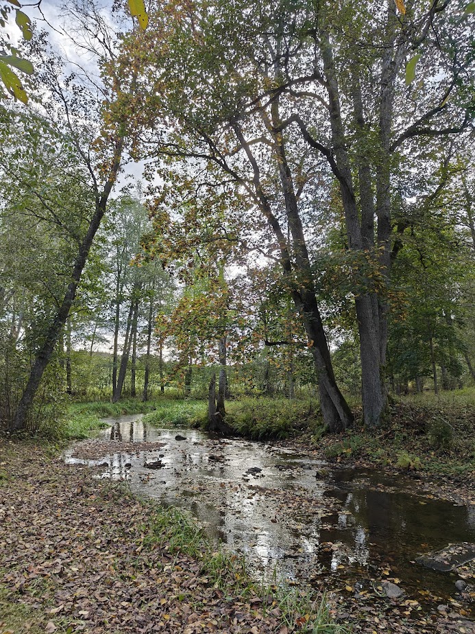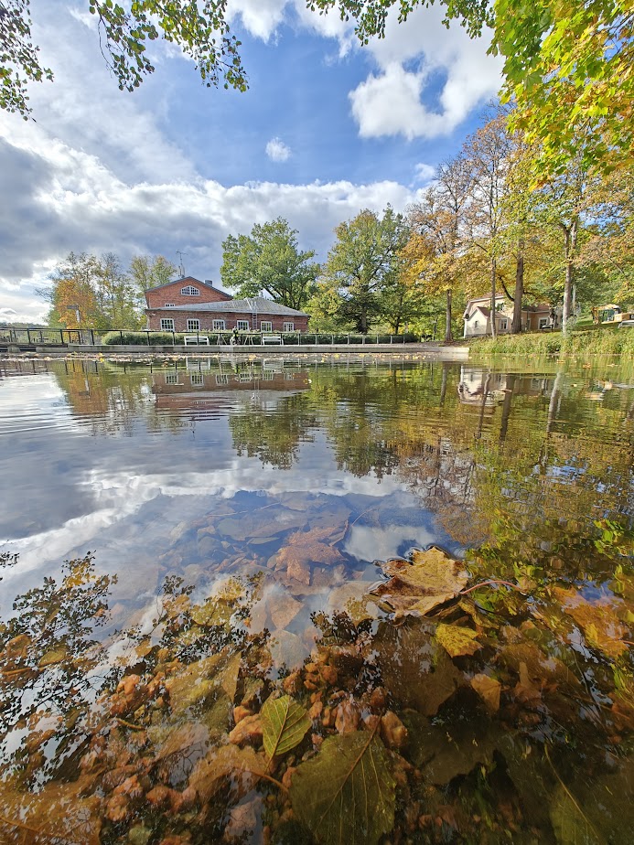 I cross the bridge over the gently flowing Fiskars River, which runs from Lake Degersjön through the ironworks village. A woman is walking her dog a little way off, and otherwise, the scenery is empty of people. I stop on the bridge to admire the water and the drifting autumn leaves, some of which have already settled on the shallow riverbed.