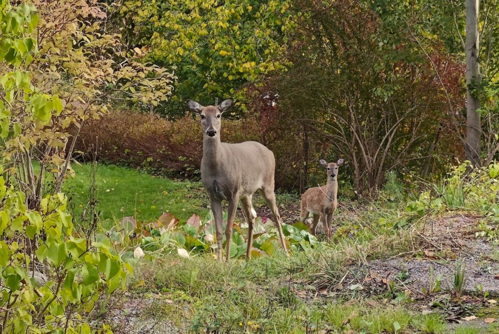 I glance at the map on my phone to confirm the route as the Tree Species path meanders back toward the village street, ensuring I’m on the right track. As I put my phone back in my pocket, I initially think I’m seeing a garden ornament, but a closer look reveals that it’s a living white-tailed deer. At this point, the distance between us is still about forty meters, and I notice that it is standing right by the roadside, where I’m supposed to pass. As I walk calmly closer, I also spot a fawn.