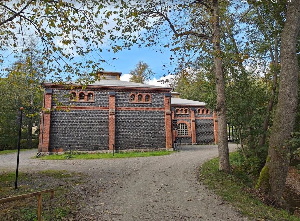 The sound of the rapids fills the soundscape, and on the riverbank, an old slag-brick mill is currently being restored. It is one of the village’s most centrally located and, in my opinion, also one of the most beautiful buildings, so it feels good that it’s being cared for, even though it’s currently wrapped up and hidden from view. Another stunning slag-brick building can be found a short distance downstream; I will visit it shortly.