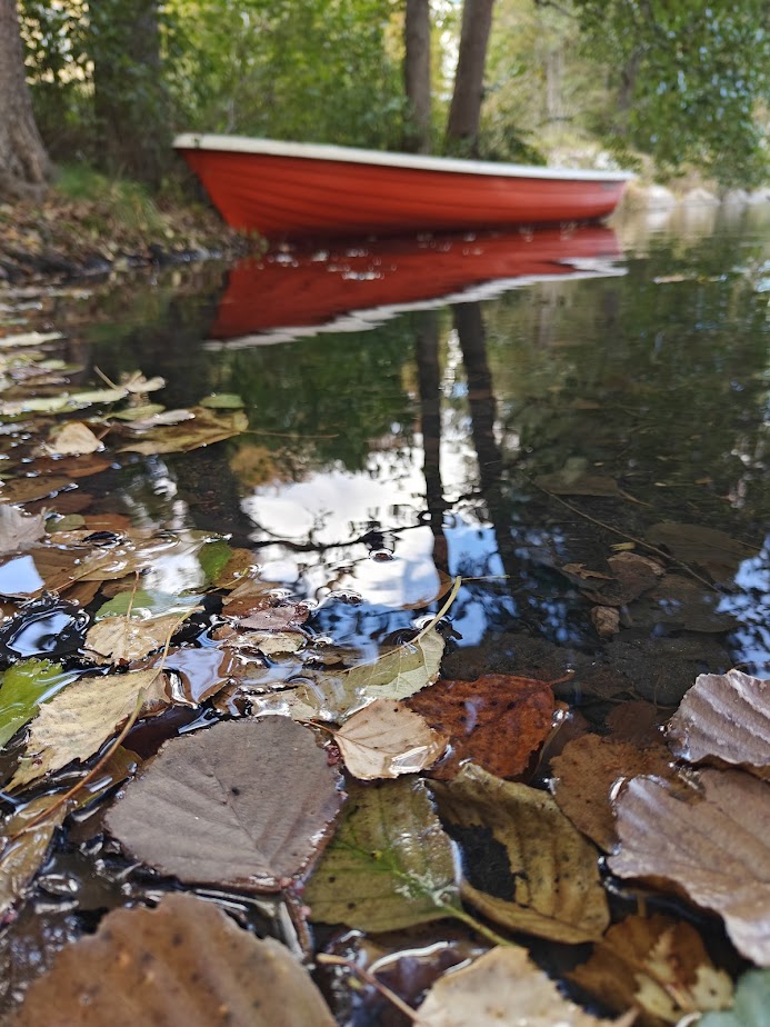 I’m delighted to find that there is access to the lakeshore. The gentle waves of Lake Degersjön lap against the shore, dancing hypnotically with the maple, birch, and alder leaves that have fallen into the water. The clear water is so beautiful that I find myself crouching down to touch it and even record a short video to capture a glimpse of its beauty. I stand at the spot where the Fiskars River begins. I might also be standing at the very origin of the village’s name, as legend has it that the village was named after a fisherman (fiskaren in Swedish) who settled on the shores of Lake Degersjön.