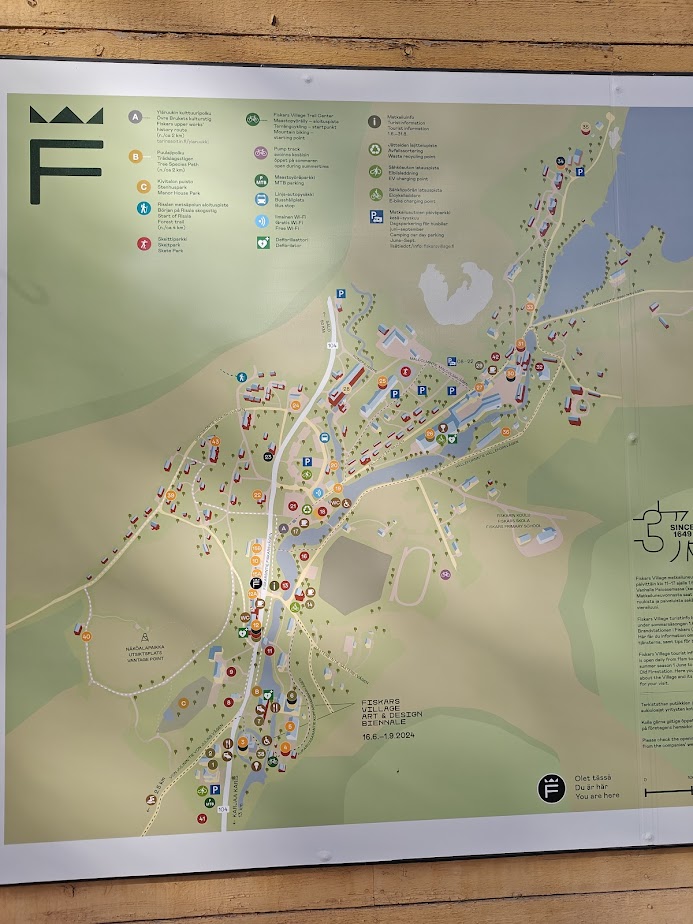 Right at the parking area, two things catch my attention: there’s a long row of city bikes available, and a large map at the edge of the parking lot gives hints about where to go, whether you choose to walk or cycle. I recommend taking a moment to study the map, as without it, you might miss out on a lot. The map makes it easy to grasp the village’s layout, and it also marks the circular trails: the Upper Works culture path (‘Yläruukin kulttuuripolku‘) with a gray dashed line and the Tree species path (‘Puulajipolku‘) with a white line. You can download the map in PDF format from the Fiskars website, and you’ll also find these same maps scattered throughout the village, which is very helpful.