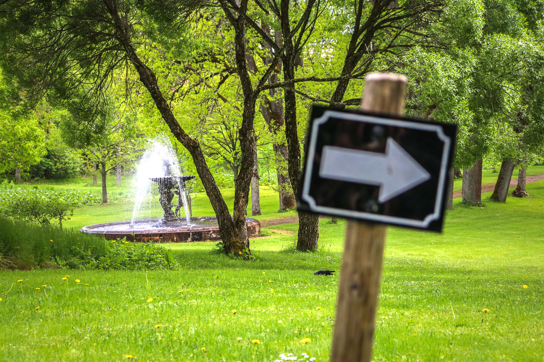 In front of the manor stretches a large park with streams and lawns, and even a fountain. Access to this area is restricted, but the arrows in the picture below guide you on the appropriate route to walk by the manor.