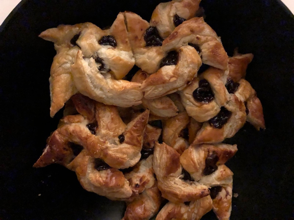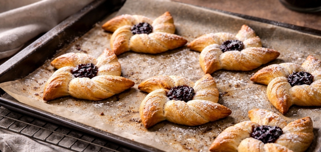 The pastry points are folded alternately towards the middle to create the familiar star shape. Once the shape is formed, a spoonful of plum jam (or another chosen filling) is placed in the centre. Whether you place the plum jam in position before shaping the pastry or only add it on top of the finished four-pointed star is a matter of personal preference. Both methods are commonly used.