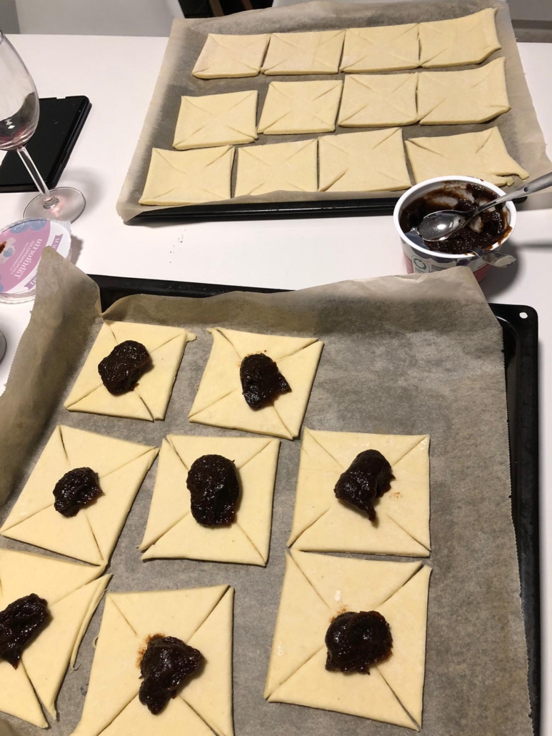Making a joulutorttu begins with ready-made puff pastry sheets, which are taken out of the freezer and left to thaw at room temperature. Once the pastry has softened but is still cool, the sheets are usually cut in half, forming palm-sized squares. Slits are then cut from each corner towards the centre.