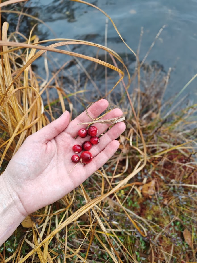 I eventually arrive at the pond’s shore. The shoreline reeds glow orange in the otherwise gray day. I remember how in the summer I soaked my sweaty feet in the pond and got to know the pond’s bottom through the sense of touch in my soles. This time, I skip that. However, I sit for a moment, and then it occurs to me to check if there are cranberries hidden in the shore hummock. I end up finding a small handful to munch on—a bit unripe perhaps, but still good.