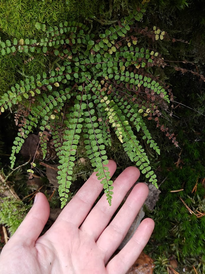 I find a rock among the spruces that I haven’t encountered before. I end up spending at least twenty minutes with it, standing and squatting, indulging my senses of sight, hearing, smell, and touch. The rough surface of the rock is covered with an incredible array of October’s lush, moist life. Various mosses and lichens are layered upon it, and I can distinguish at least two different species of ferns on the surface, as well as other forest plants whose names I don’t know. Chanterelles grow in the deep moss at the foot of the rock, and there’s even a small cavity under the boulder.