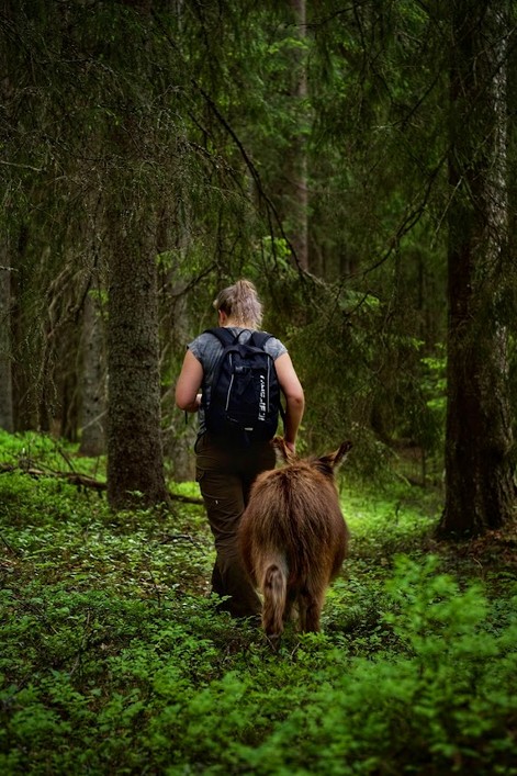 The walk continues along forest roads lined with spruce, with light conversation and soft donkey steps keeping the pace. Even if a donkey accidentally steps on your foot, there’s no harm done—at around 70 kilograms, they’re strong but surprisingly light. During the walk, it’s easy to reflect on how animals and humans experience nature differently. A donkey doesn’t judge or hide its feelings—and you can’t fool it with nervous energy. It gives honest feedback if your lunch is missing or your route isn’t up to its standards.