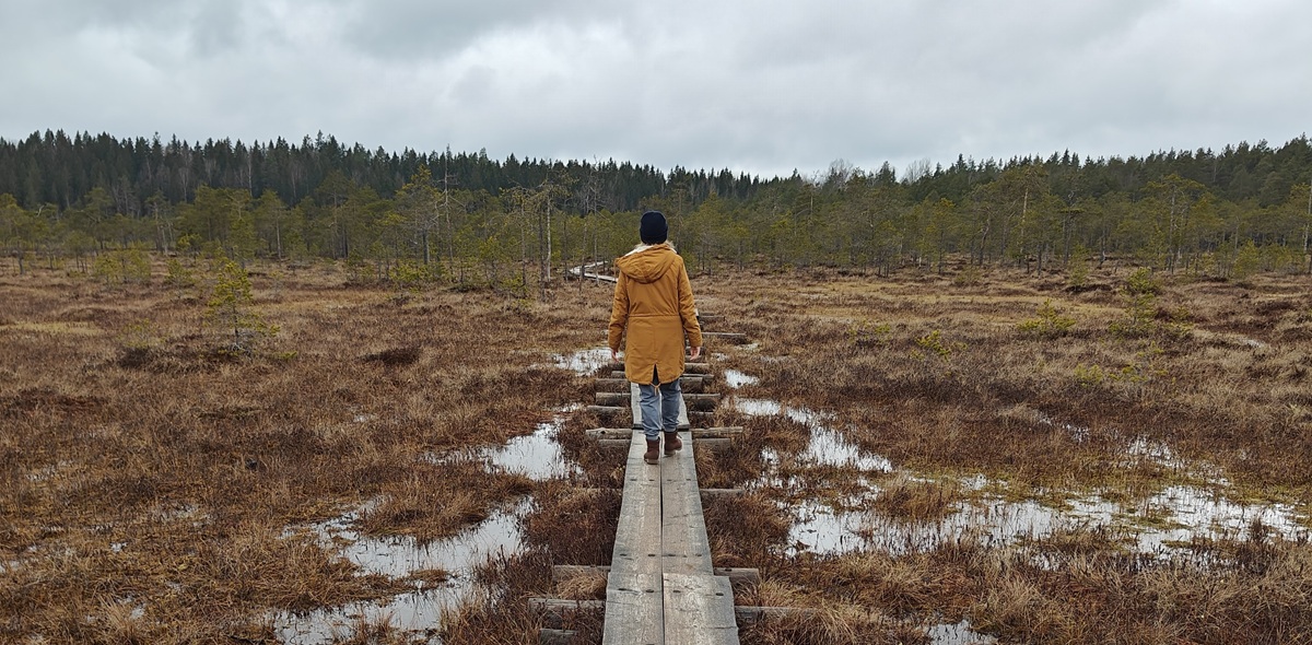 I soon decided to move on to the second activity, namely carrying the bike, which is a fundamental part of the sport according to Artturi. Even on routes that allow cycling, there are often sections that are unsuitable for beginners, some even for experienced cyclists. Carrying the bike is required for these sections, and I decided that now was the time. As I jumped off in a semi-controlled manner and felt the legs of the wooden planks under my feet instead of the marsh (huh!), I was able to take a proper look around at the landscapes. And how beautiful they were!
