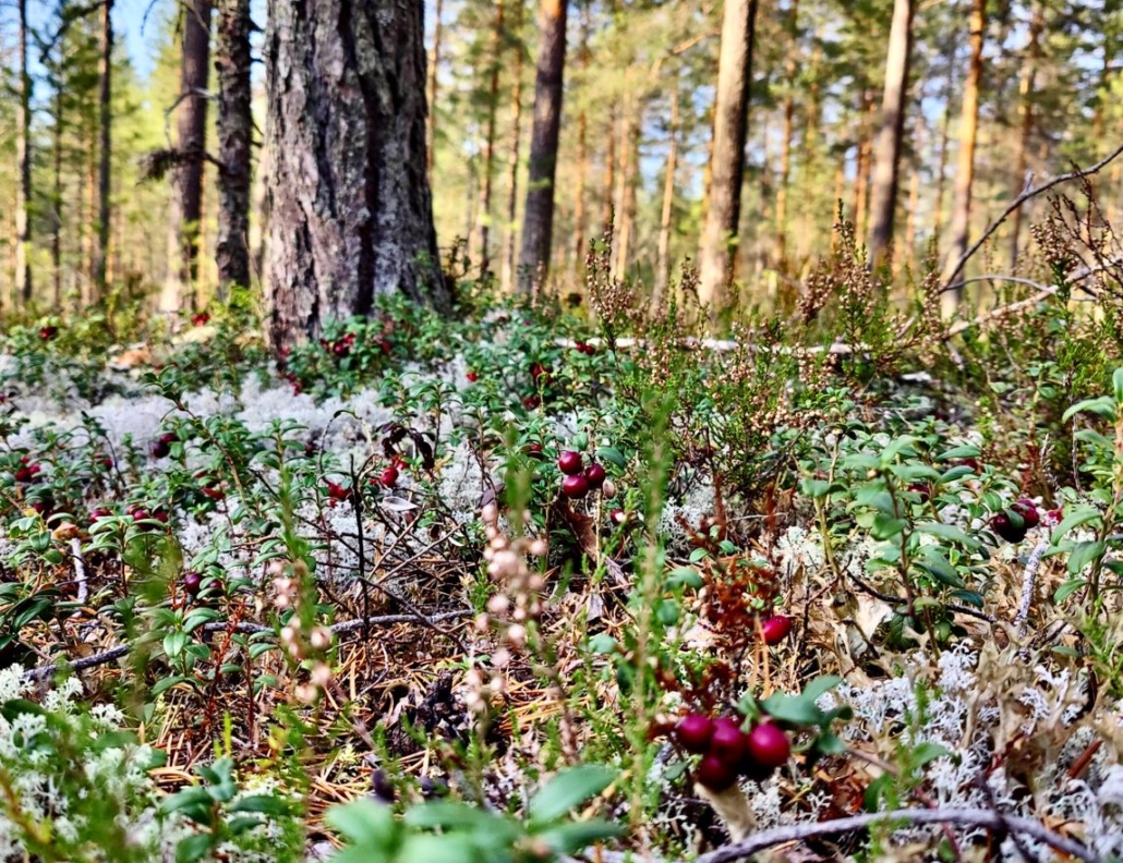 In places, the flat forest had wonderful lichen fields, adorned with lingonberries glowing like rubies!