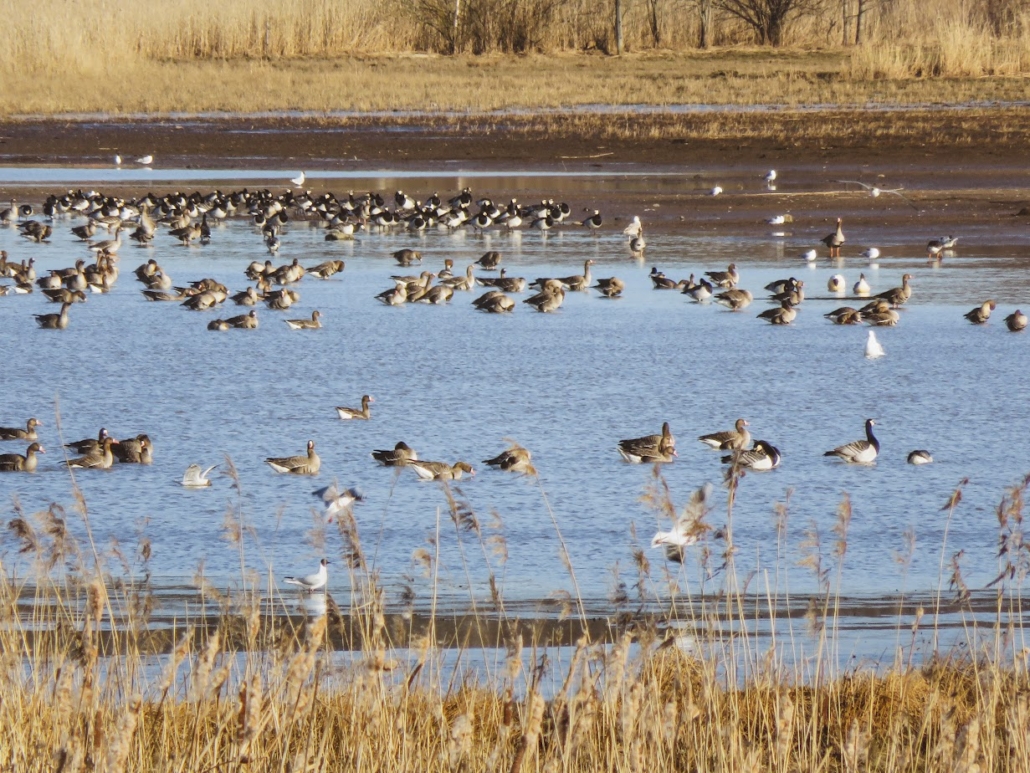 - Migration route or feeding area: a place where birds stop over or nest. Thawed wetlands, bodies of water with coastal reeds, and nearby fields are rich environments for waders, waterfowl (including geese and swans), and many small birds.
