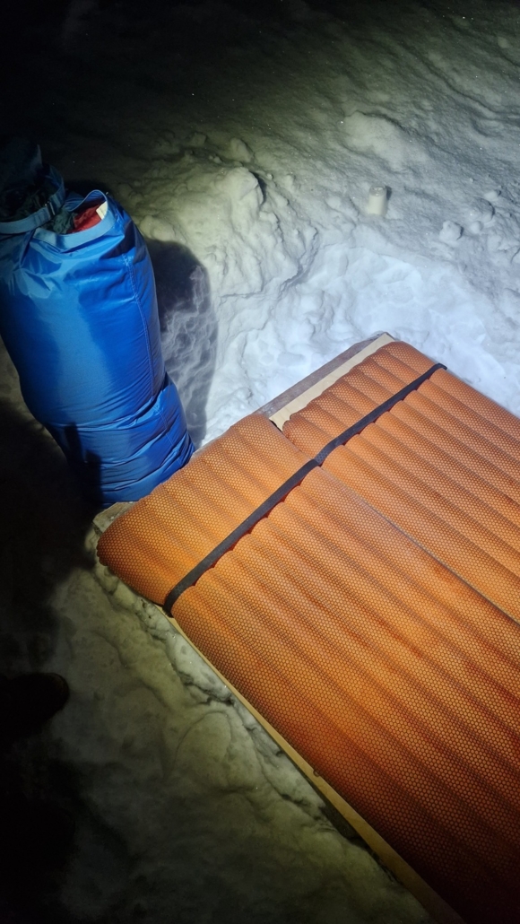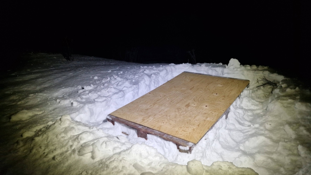 – We dismantled part of the plywood and pallets and levelled the snow underneath again. After a while of adjusting and jumping on the pallets, wearing only our merino wool base layers, we finally managed to get the bed level.