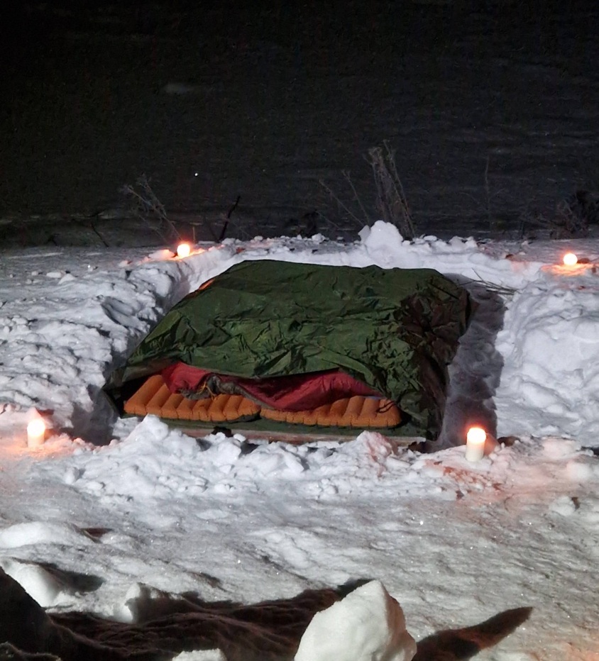 – Our shelter was based on the idea of “build a bed using whatever materials you happen to find in your cupboard and around the yard.” So there was no actual shelter as such: we built a bed in the snowdrift and slept out under the open sky, Maarit explains.