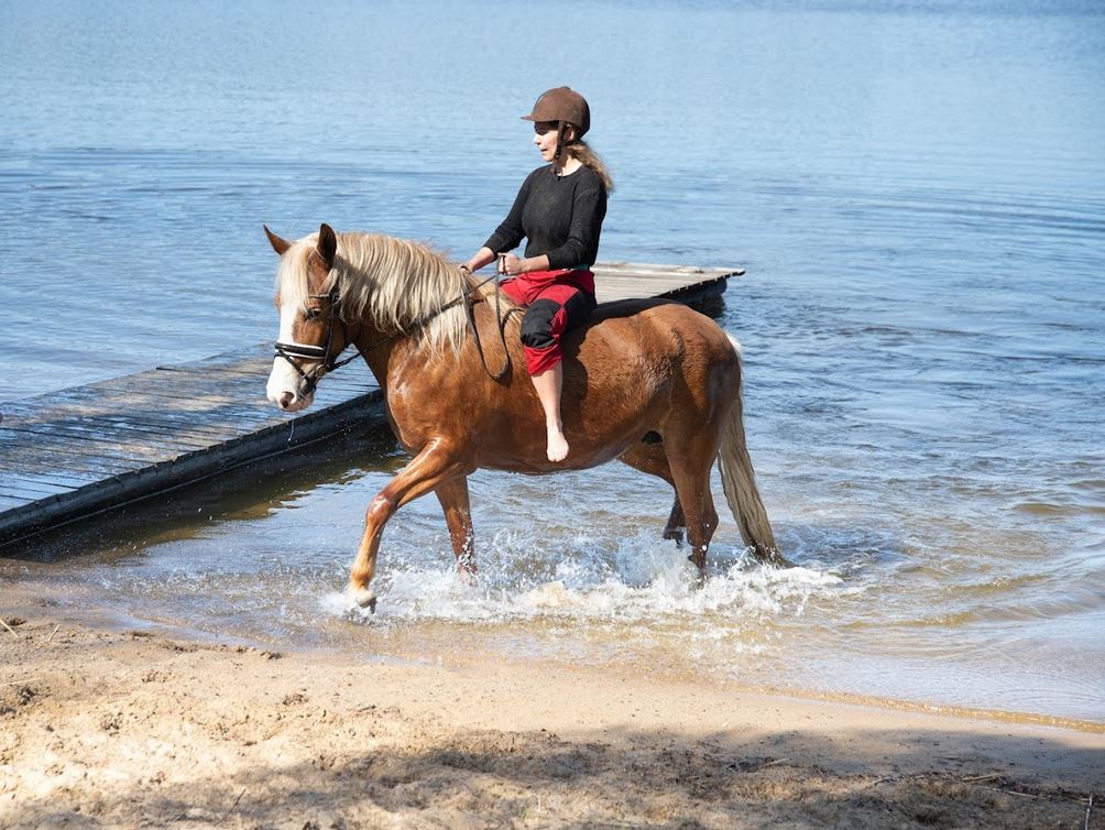 Riders mount the horses (not saddles) in the stable yard and from there the pairs are led across the grass field to their own sandy beach. The journey is short, but even small inclines feel amusing without a saddle and you need to find your balance. Upon reaching the beach, many thoughts whirl around. Can the horse swim away? How fast does a horse swim? Is the water cold? Would I rather fall on the sand or into the water?
