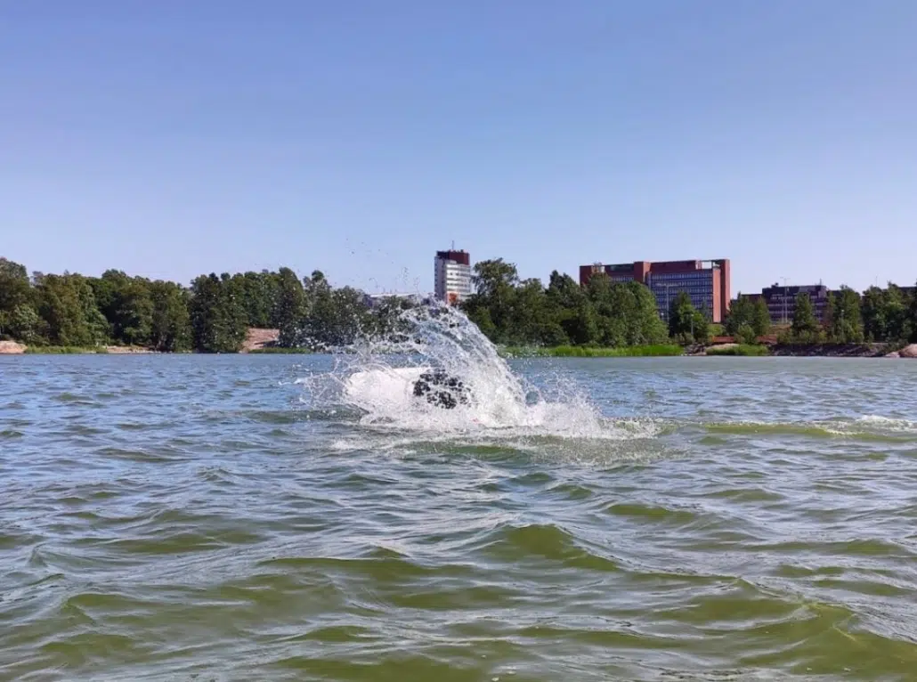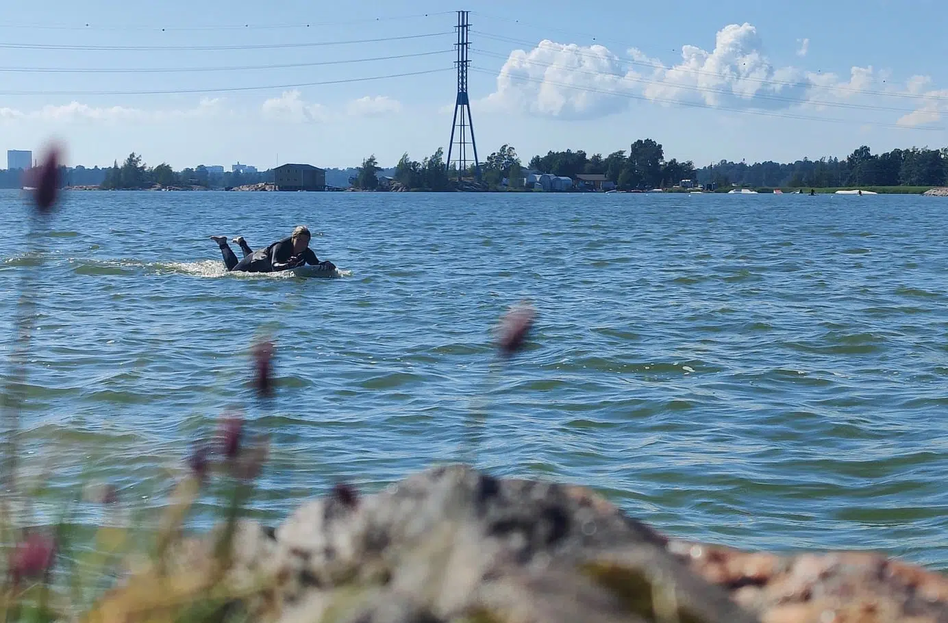 We leave our belongings at the company’s facilities and walk a few dozen meters in our wetsuits to Lapinlahti’s shore, which the City of Helsinki has conveniently designated as a motor sports area. The boards are equipped with suitable batteries, we test the compatibility of the remotes and boards, and carry the boards into the water.