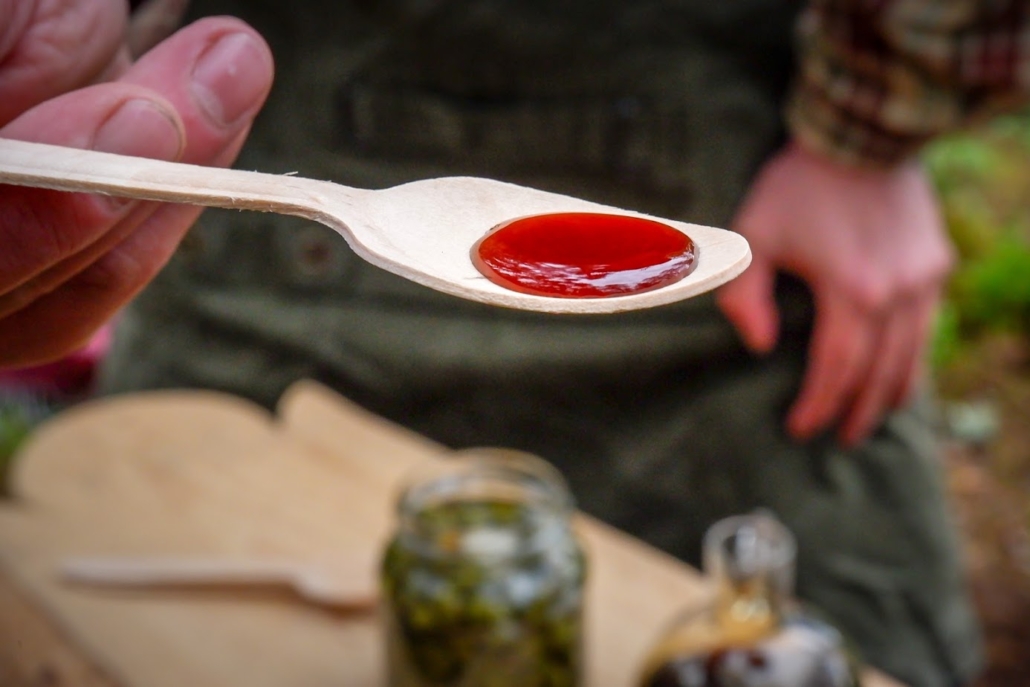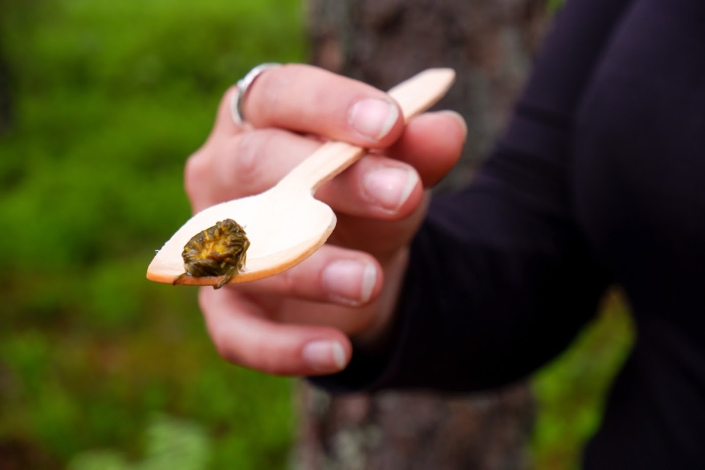 In addition to the wines, we get small samples of wild food delights conjured up from the Finnish wilderness, which complement the flavors of the wines in fascinating ways. Apparently, these small bites vary depending on which wines are featured each summer—for our selection, we had little bites of blueberry jam, pickled dandelion buds, spruce tip syrup, and freshly picked wood sorrel leaves from the forest.