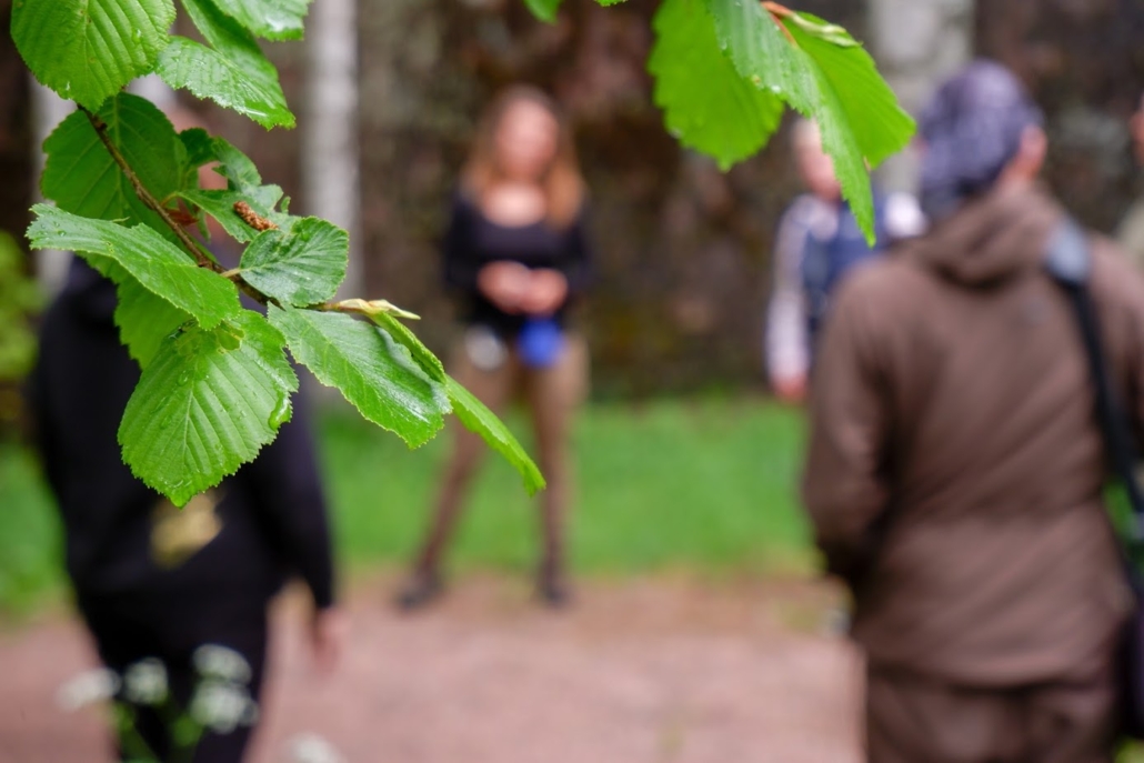 Our guide leads our small, casually chatting group into the nature of Nuuksio. I look at the tall pines and spruces swaying in the wind, and I notice that the forest floor is covered in a lush green carpet that’s almost beyond description. In the low bushes, there are tiny pink flowers. The guide tells us these belong to wild blueberry plants, bilberrys, and that as the summer goes on, those flowers will turn into dark blue, healthy berries.