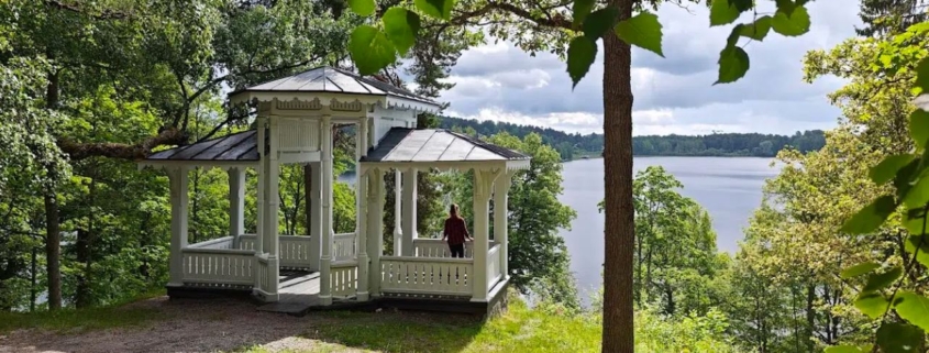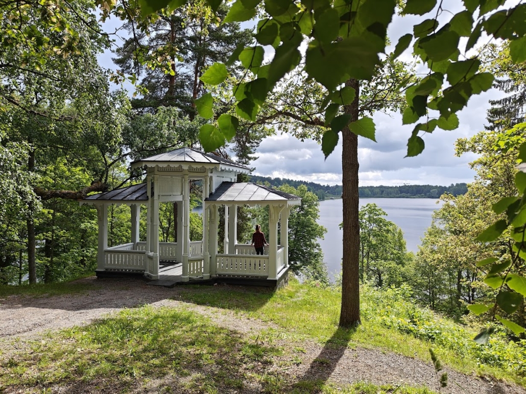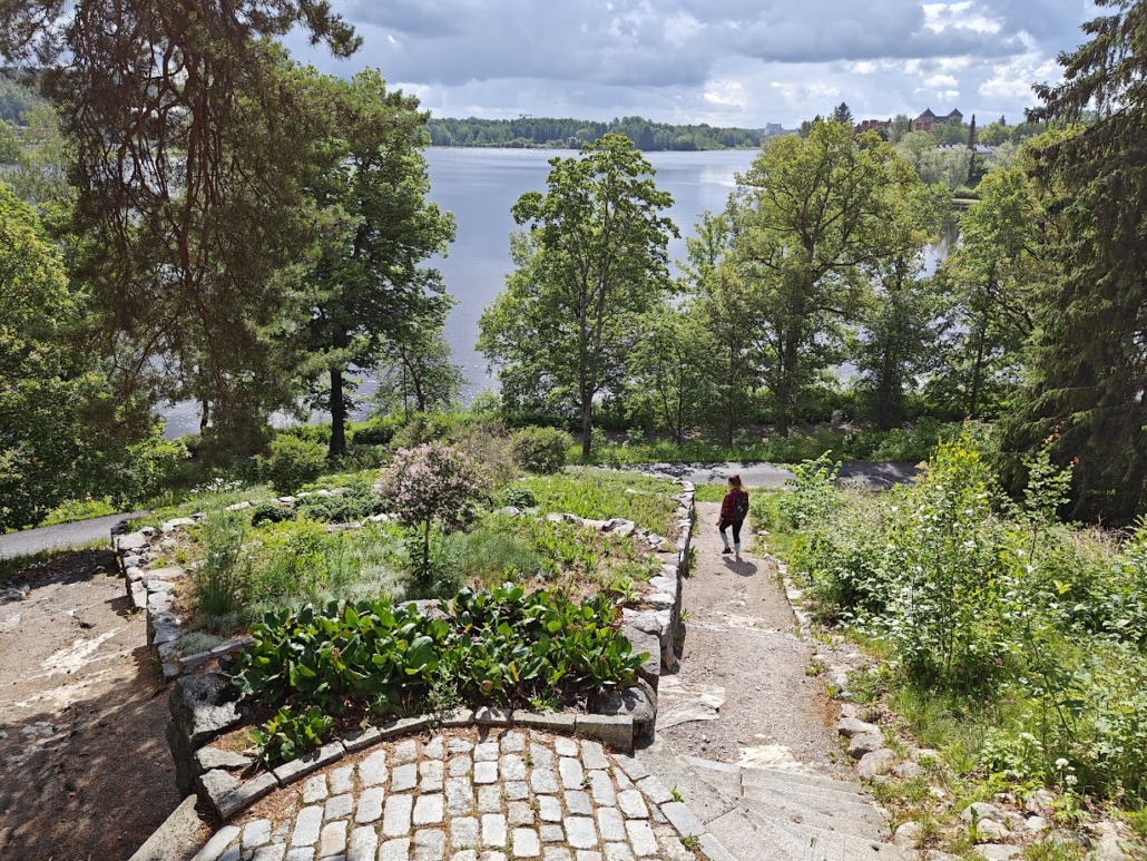 After leaving the barracks buildings behind, we arrived at a point with route options. The main lakeside route continued closest to the water, but a narrower path leading up the hill invited us to dive into the City Park, known locally as “Parkki.” A little brisk climb up the hill, and we found a place that my hiking companion immediately declared to be the most beautiful viewpoint in all of Hämeenlinna.