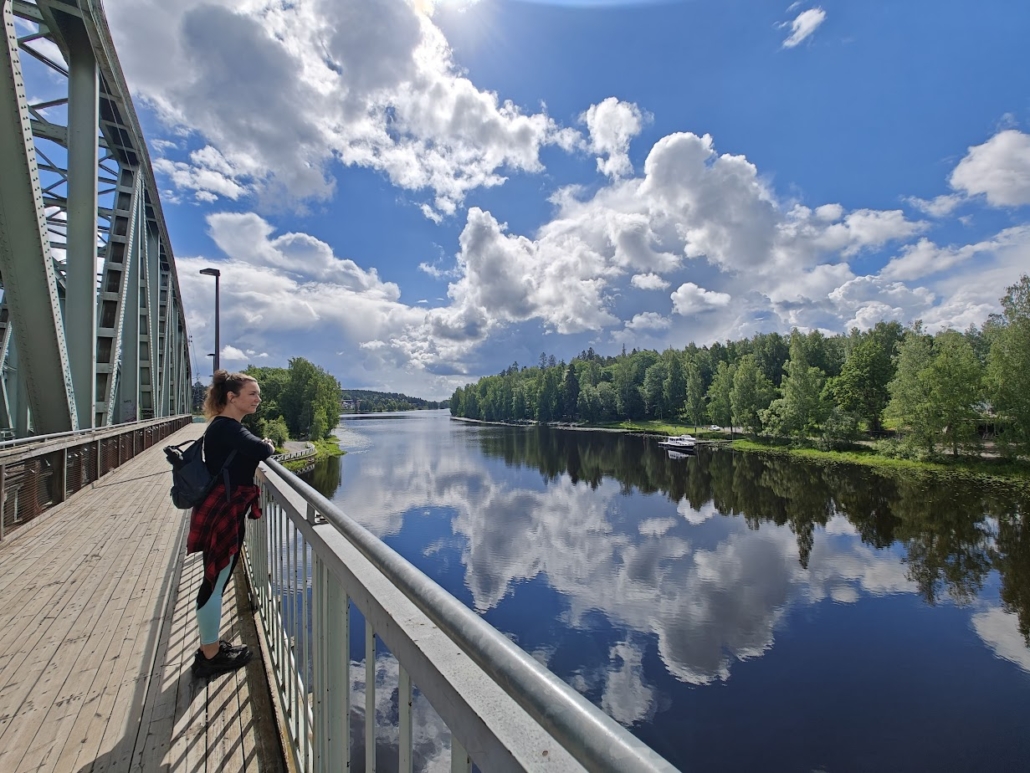 From the opposite shore, we had seen the train pass the city several times by now, and we reminisced about the time we once traveled to Lapland on the night train and saw the Häme castle beautifully illuminated from the train in the evening. Now we arrived at the railway bridge, where we were supposed to cross the water. We found a sign indicating that one could borrow the city’s rowing boat for free from here, but the boat was not home now. So we climbed onto the railway bridge and crossed the water along it, accompanied by the cheerful, summery chirping of barn swallows.