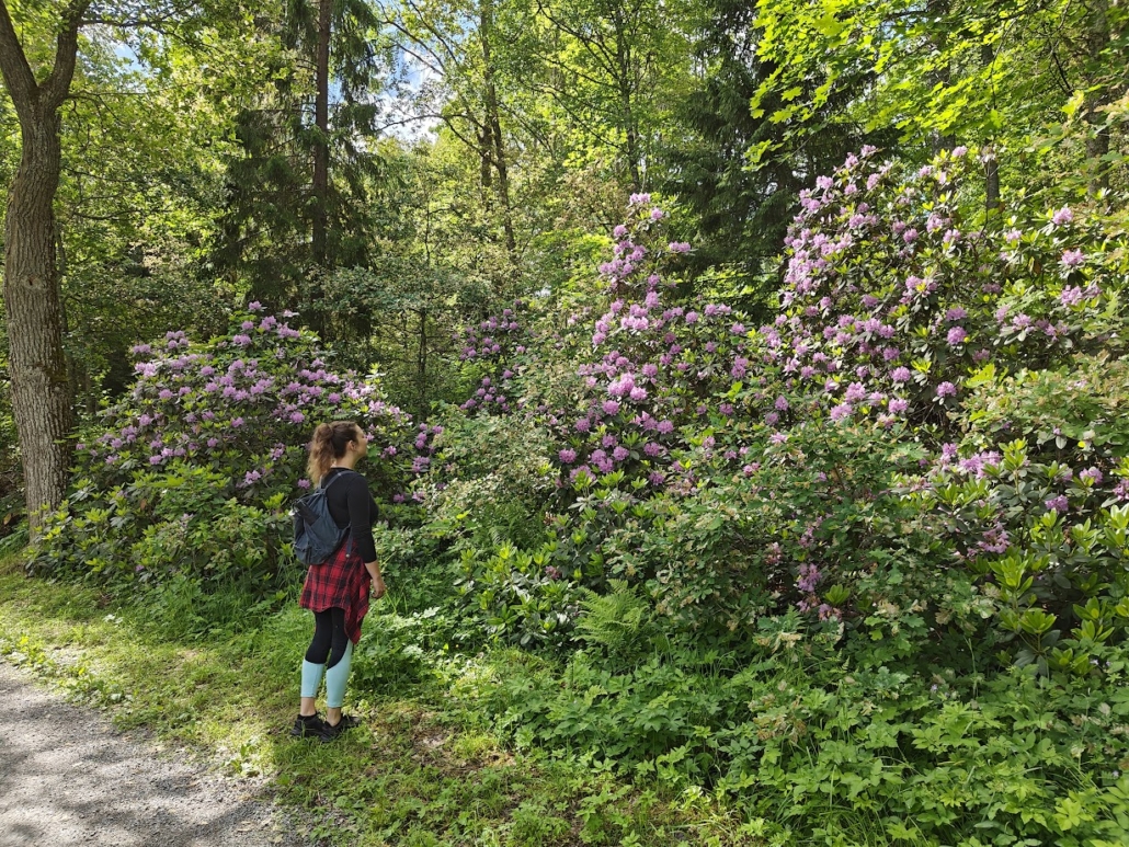 I wasn’t surprised but was greatly delighted when we got to pass by rhododendrons still in full bloom, which rose not only directly along the route but also higher up in the forest hill.