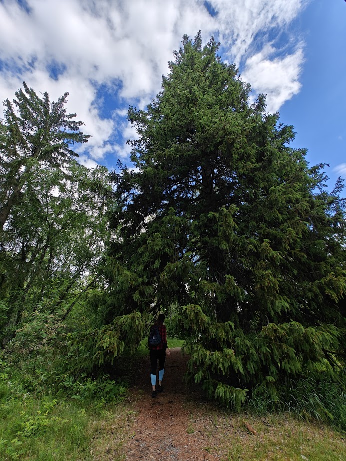 To reach the gazebo, we walked under the branches of a large spruce. The lowest, long branches of the spruce hung down to the ground, forming a wonderful passage under the tree. There were human-sized openings between the branches, allowing us to pass through without ducking. The spruce was truly impressive, like nature’s own magical gazebo. I wonder how sheltered it is under there in winter?