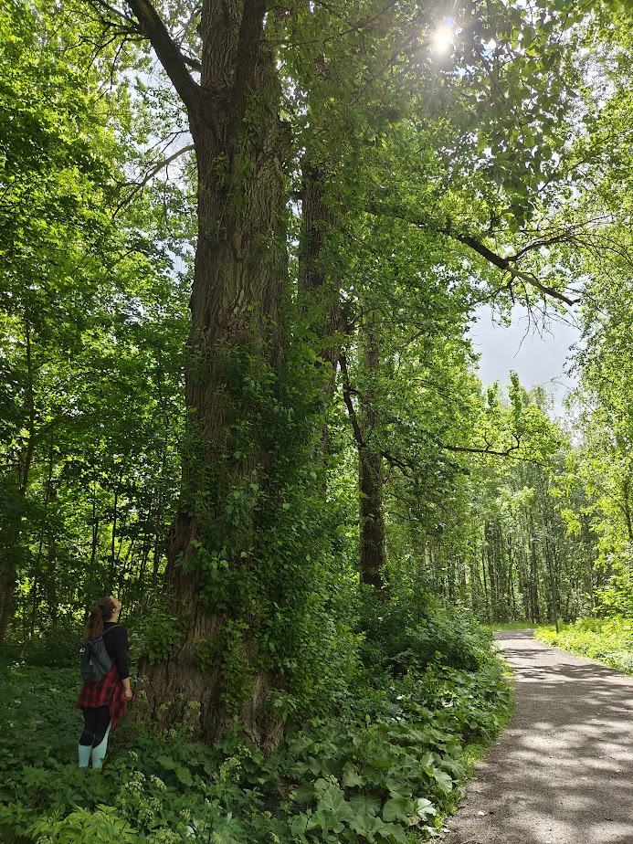 After passing an Iron Age dwelling site that had turned into a grassy flower meadow and a red-brick chimney building—with its wooden red yard sheds, understood to be an old sawmill—spotting and identifying the giant trees was not difficult. The trees were so large that no photograph could tell the truth; they must be seen by everyone themselves. A truly magnificent attraction along this route! And indeed, all tree lovers in general will be generously indulged by the Vanajavesi lakeside route, so if you or your friends love trees, this is the right route for you.