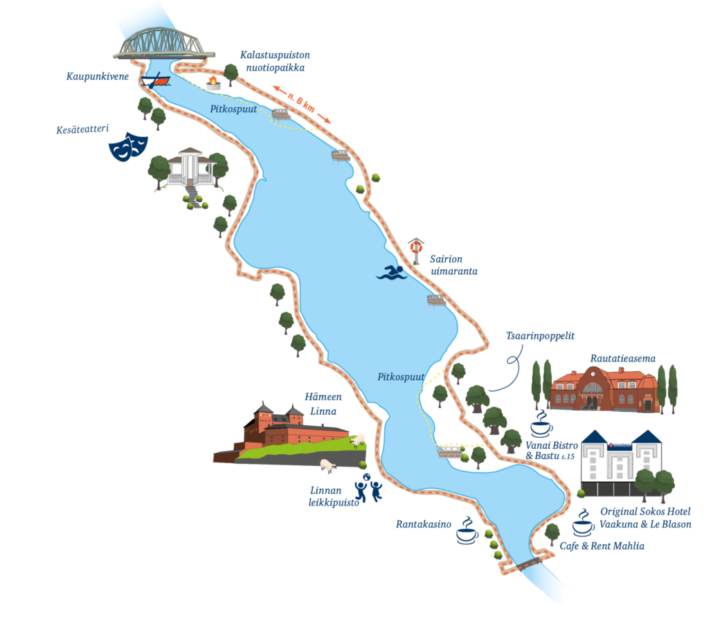 We had studied the map in advance to know which spots along the way were real highlights: Häme Castle, of course, the courtyard of Museo Militaria, the Parkki hill of the City Park with its gazebos, the Fishing Park’s boardwalks and campfire site, and the large Tsar’s poplars, one of which is said to be the tallest of its kind in the entire country. Knowing these attractions, we decided to remember them by heart so we wouldn’t need the map—we would just follow the shore and enjoy carefree, wonderful, and captivating outdoor activities. Sometimes it’s so nice to just walk and admire without glancing at a map! The route is not marked in the terrain either, but by staying as close to the water’s edge as possible, you manage well.
