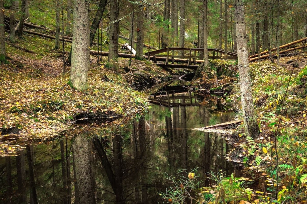 Nahkiaispolku descends steeply through a magnificent spruce forest, carpeted with moss, down to the Myllypuro (Mill Stream) valley, where the stream flows dark and serene. The stream’s banks are lined with trembling aspens that shimmer with autumn colors. There are no campfire or rest areas along Nahkiaispolku, but at the start and end point at Haukkalampi, the nearest facilities are at Haukanholma and Mustalampi.