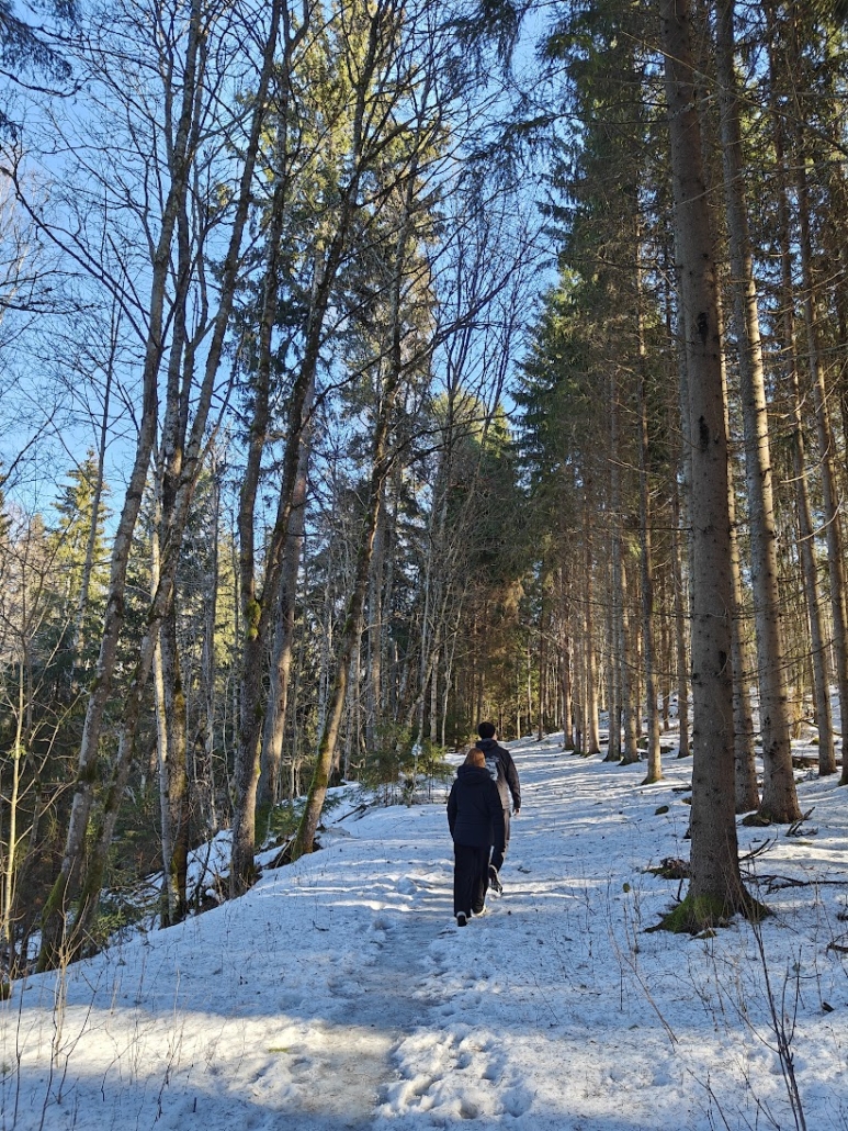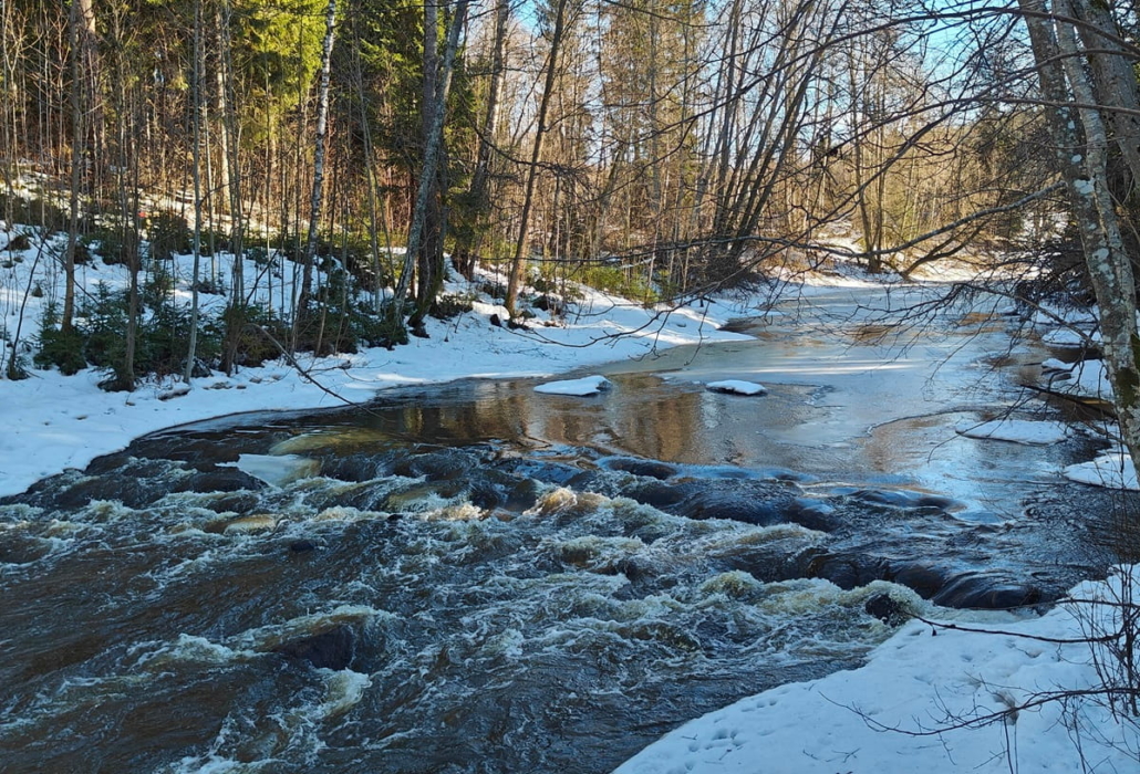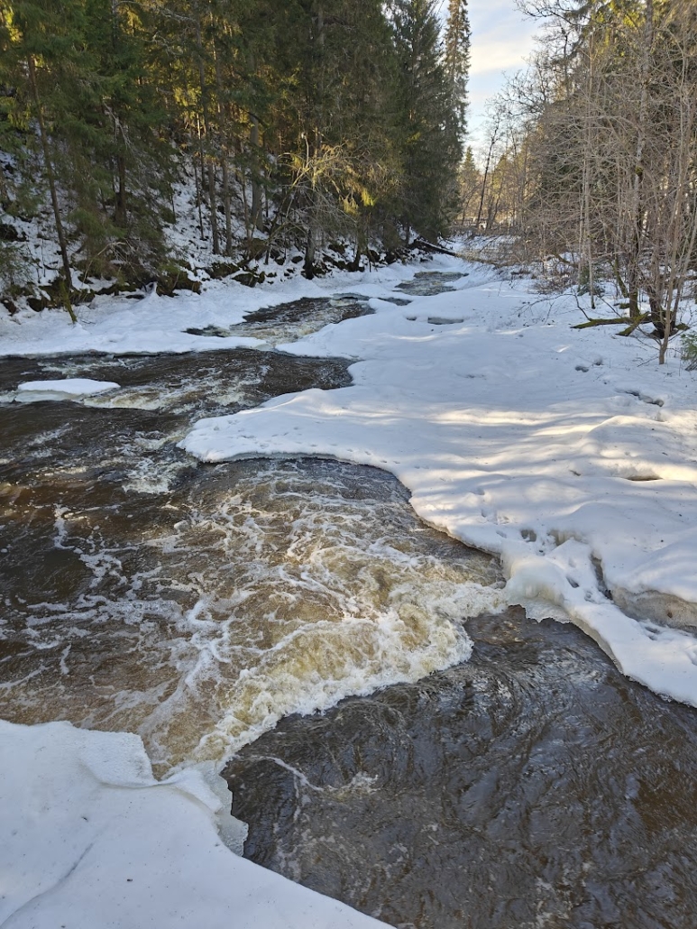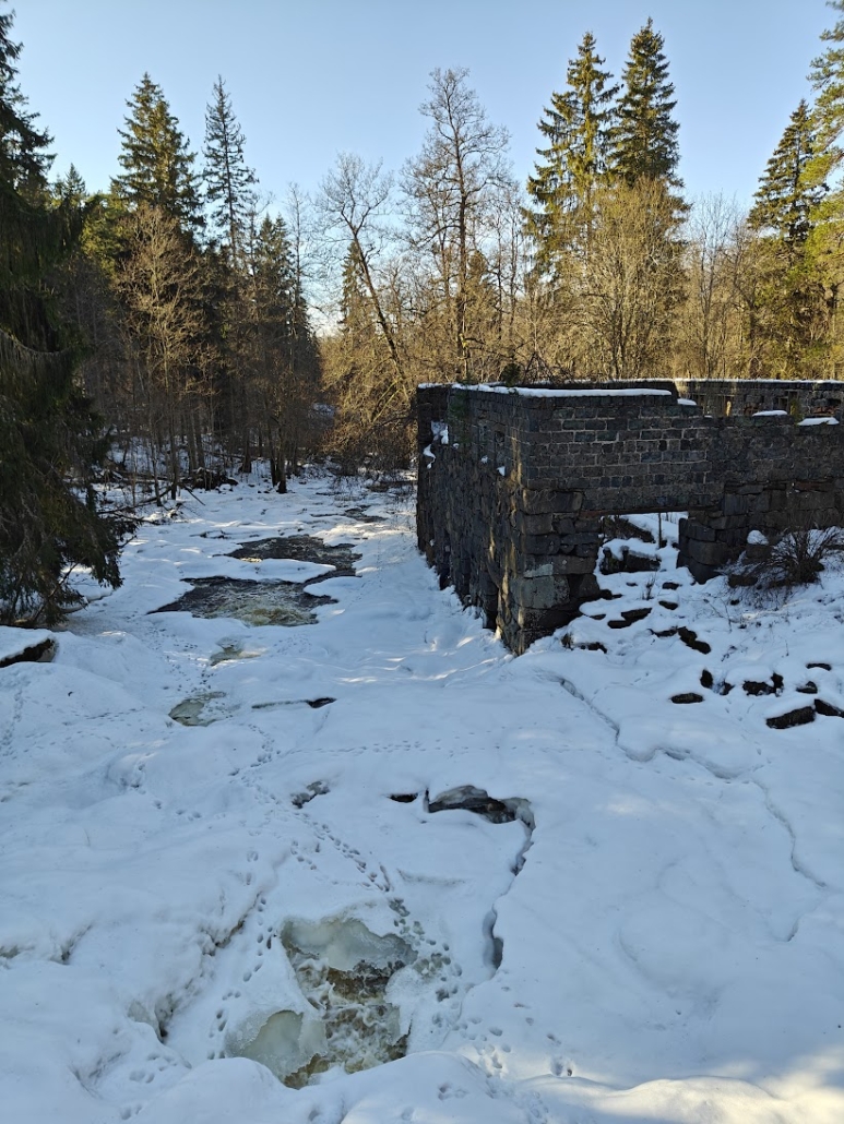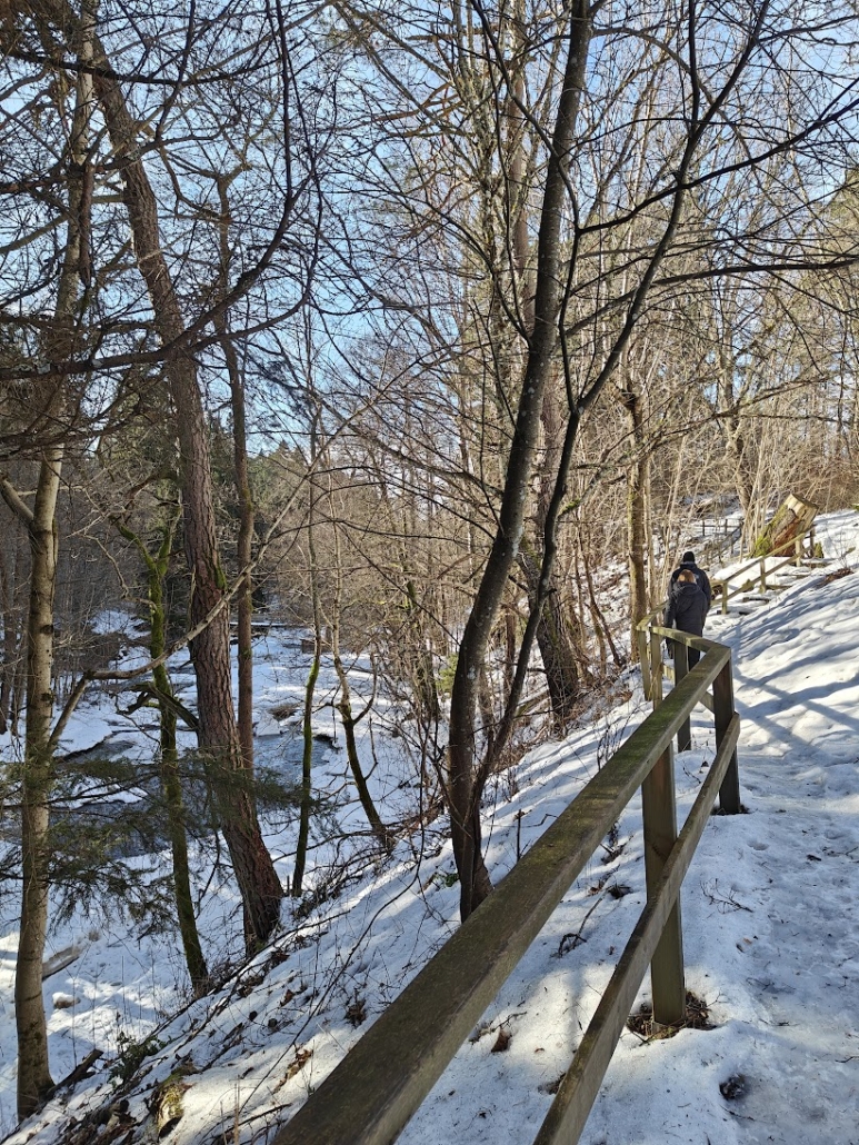 The highlight of the route is definitely the first bridge. We watched dark water rushing freely against the edges of the ice, and right at the edge of the rapids rose an old, stone mill ruin. It is an impressive sight that reminds one of the area’s history. We continued along the path, which is partly built with stairs and railings to help navigate the steeper sections. Even though we didn’t manage to spot otters, kingfishers, or white-throated dippers this time, the sound of the rapids and the movement of the water were enough to invigorate both body and mind. It is amazing how even a short forest walk can reset one’s thoughts.