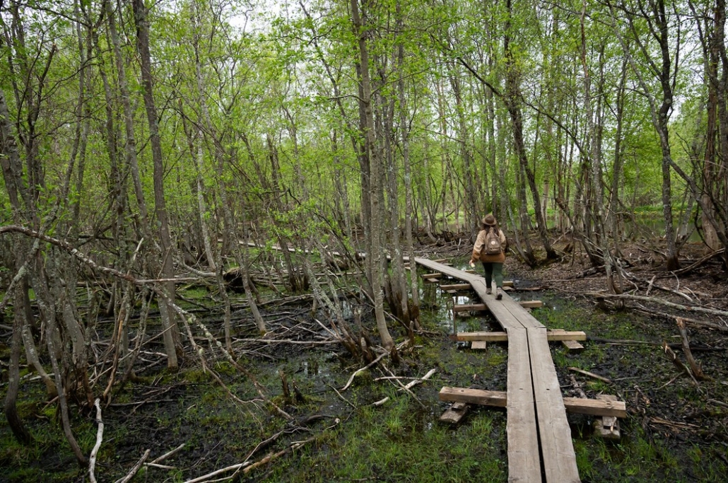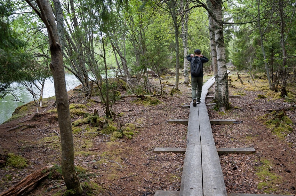 We started along the duckboards that follow the riverbank, all the while admiring the river delta landscape. Here, the tree canopy dimmed the light, and every shade of green seemed to shift and shimmer as we walked.