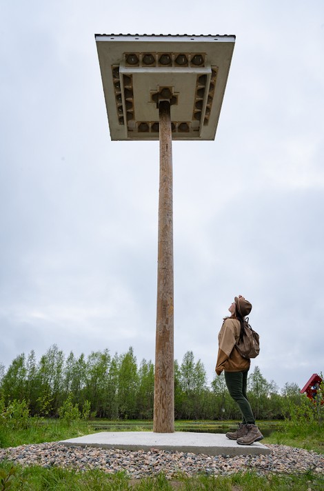 From up high, the view stretched far and wide! We were treated to a breathtaking vista over Hiastinlahti Bay, a nationally significant wetland area known for its birdlife. According to what we’d read, it’s possible to spot white-tailed eagles, short-eared owls, ospreys, or waders from the tower. It was especially nice to see that binoculars were available in the tower—a welcome addition, as you don’t always remember to bring everything with you. Suddenly, we heard a sound, and a mallard flew over us, circling toward the shore.
