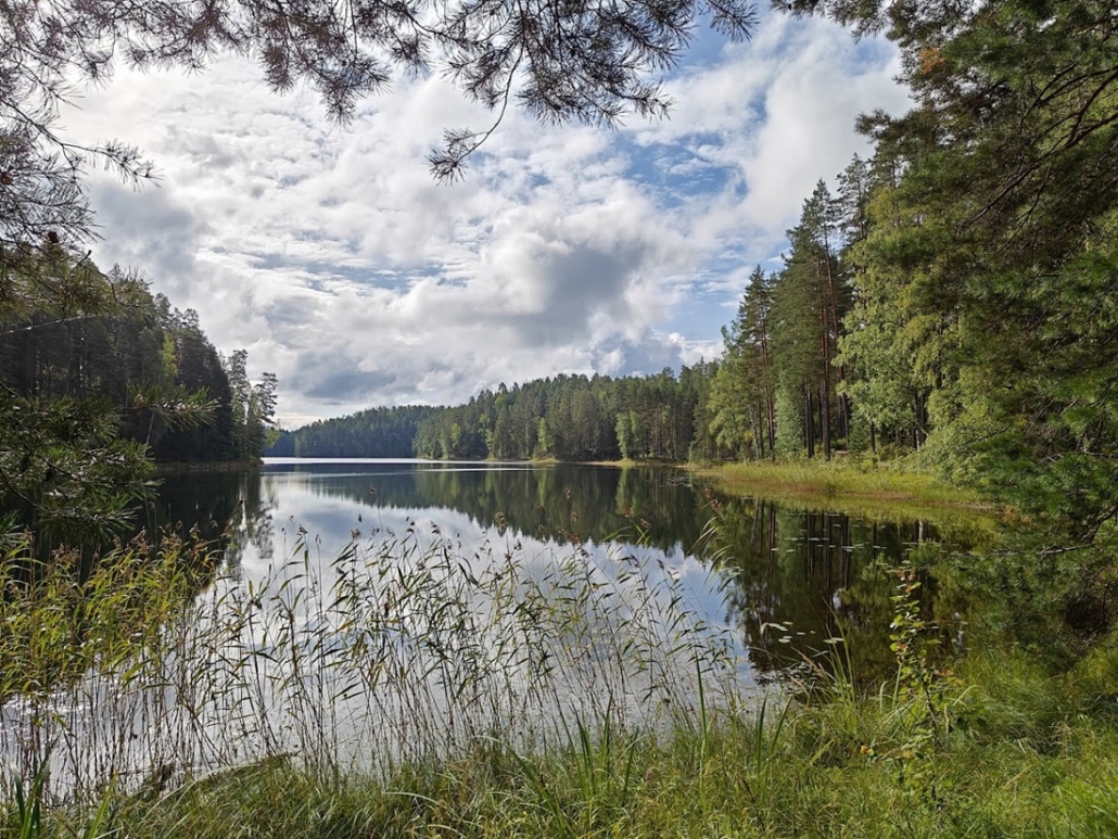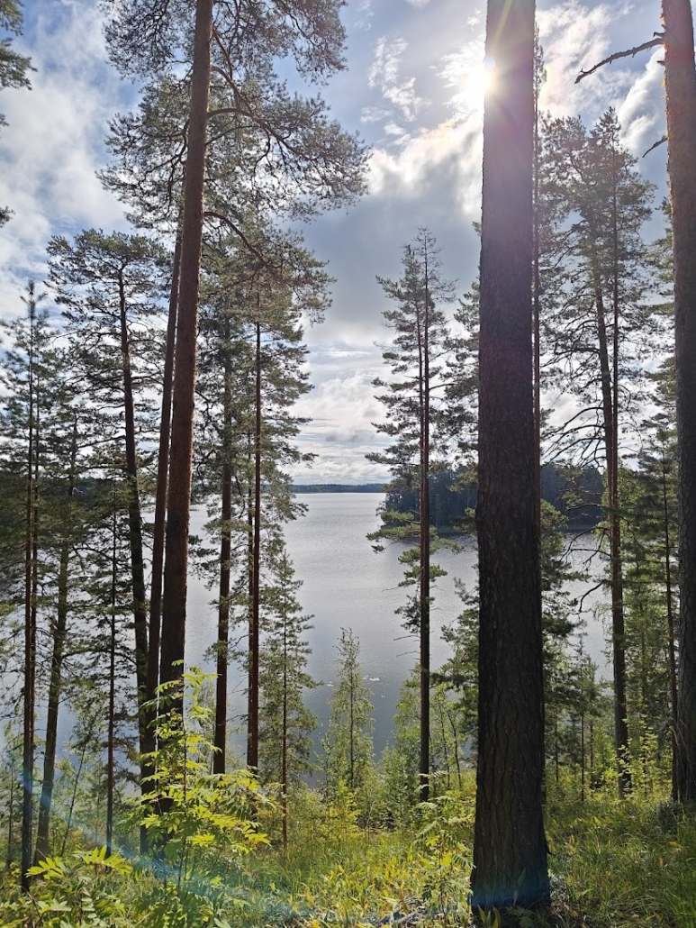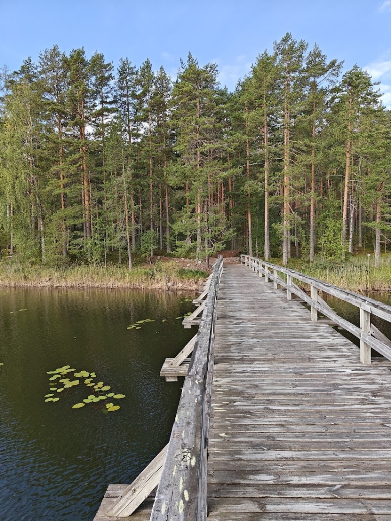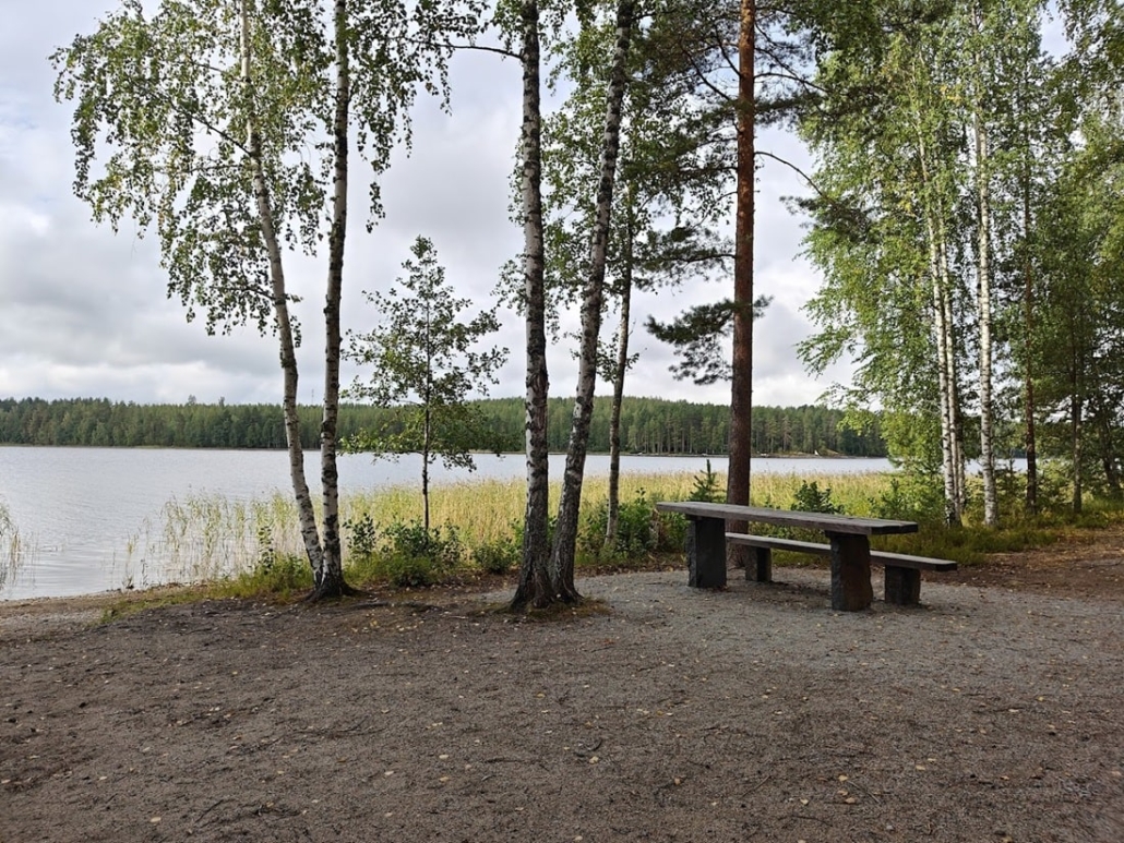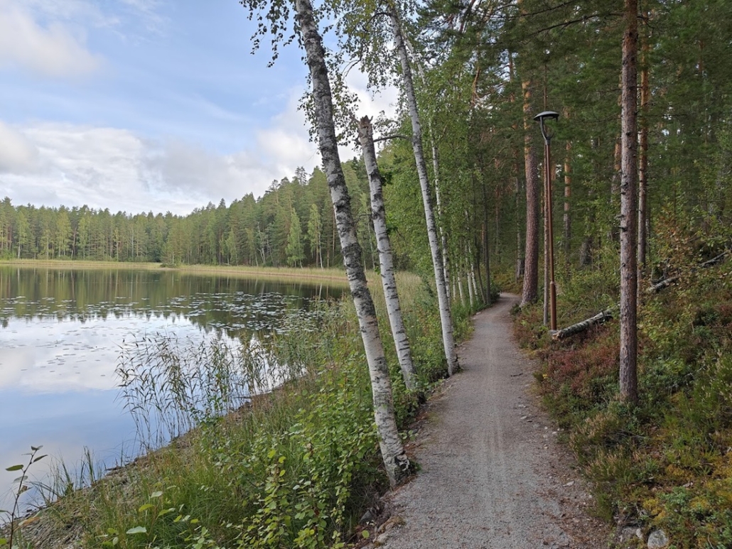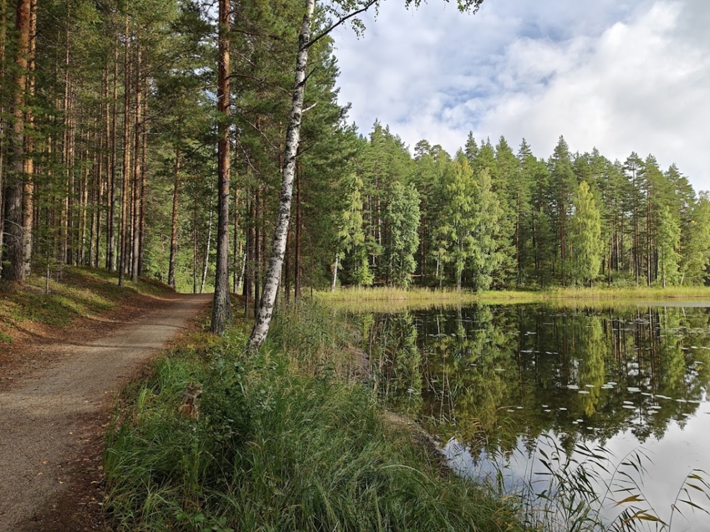 Up to this point, the forest trail turned into a lakeside path. The scenery by the lake was truly beautiful, and the path itself delightful to walk. On the opposite side of the water rose the ridge with Punkaharju Ridge Road (“Punkaharjun Harjutie“) running along its spine. The traffic was not disturbing – or perhaps we were simply so happy and content that we didn’t notice it. Only one cyclist rolled past us; otherwise, we encountered no one.