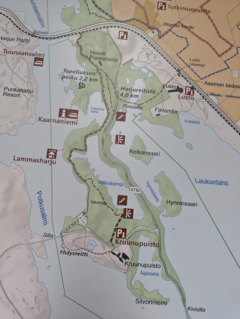 Punkaharju is literally diverse, so here is a map to start with. The map shows, for example, both Lusto station (“asema“) and Retretti station – both of which are conveniently reached by train. You can simply choose which station is more suitable for starting your hike. Getting to Punkaharju by train is very easy, making it a great choice also for those travelling without a car. We, however, were on a road trip in Eastern Finland and came by car, which we left at the Kruunupuisto parking area shown at the bottom of the map.