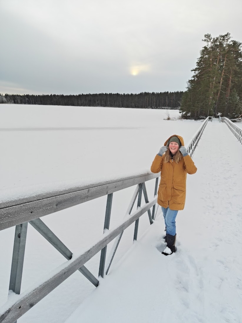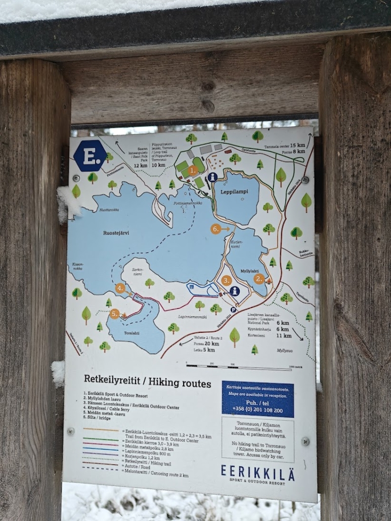 The wind on the bridge was biting. We crossed over and stepped onto the isthmus that, in turn, separates Lake Ruostejärvi from the round-shaped Leppilammi pond. From here it would have been only a short distance to Eerikkilä Sport & Outdoor Resort, but as we had no plans to head that way, we simply admired the views and then turned back toward the bridge, and Kurjenpolku trail.