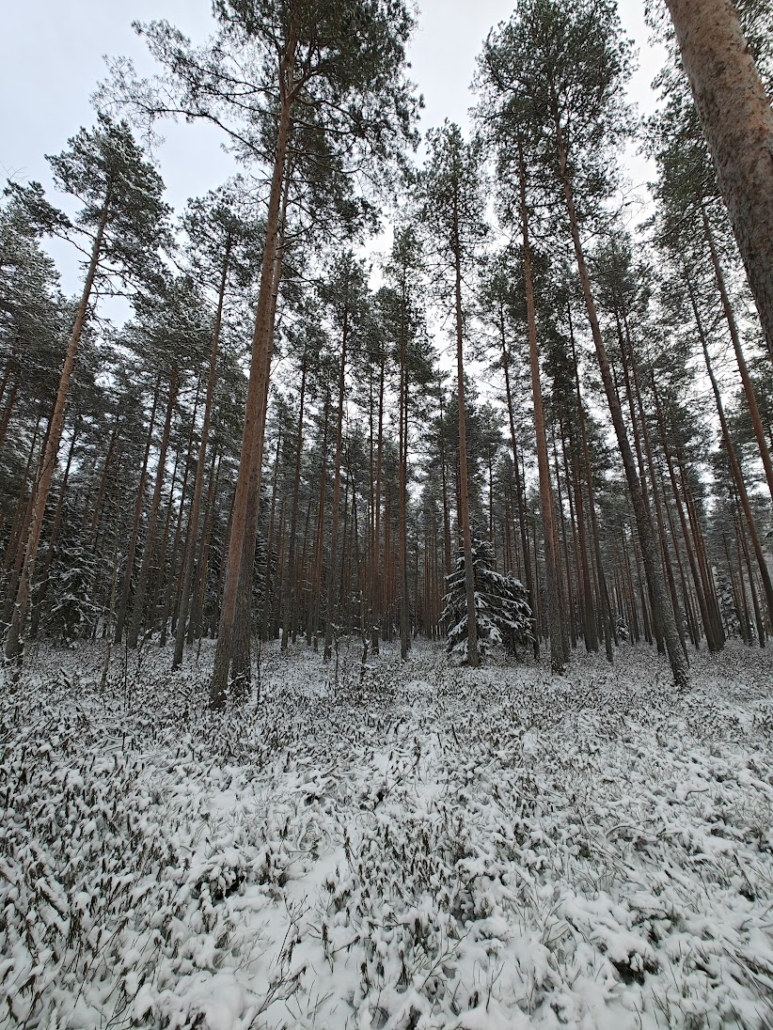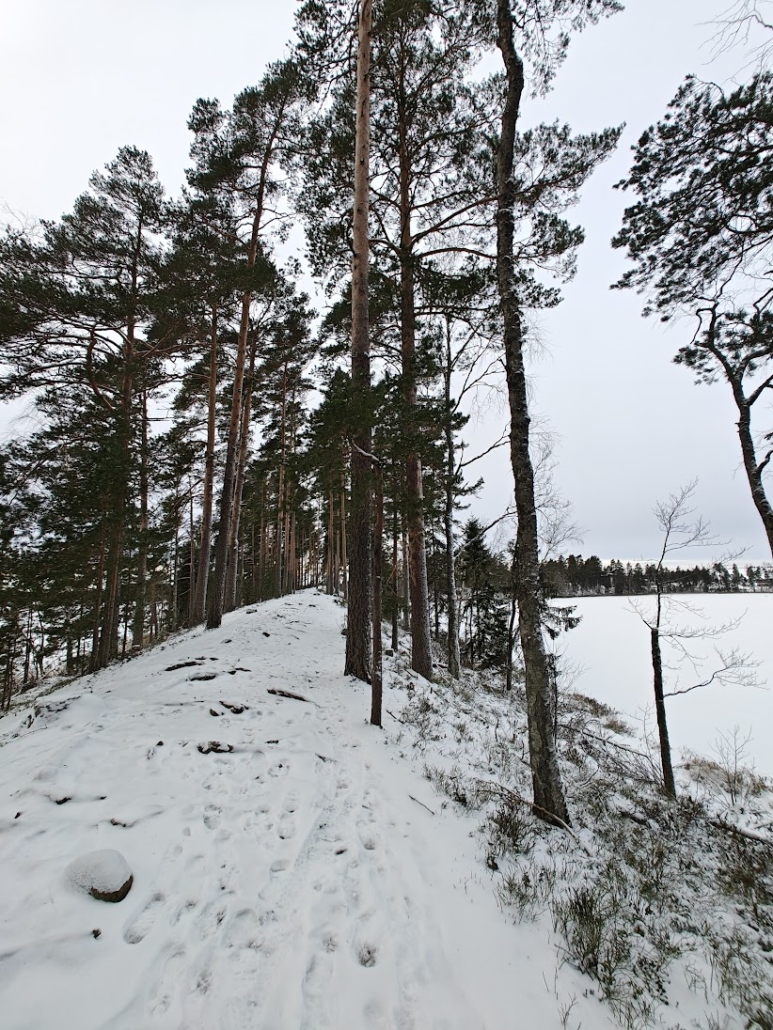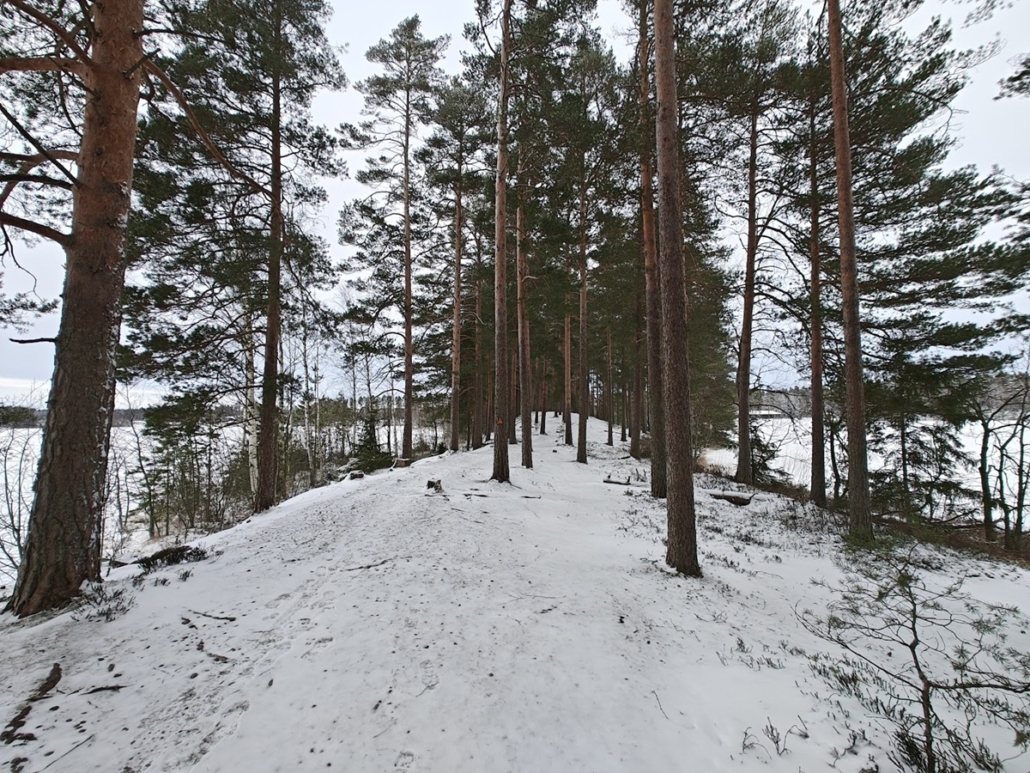 We were soon back on Kurjenpolku, which next led us to the beach. Once again, my attention was drawn to the abundance of labrador tea, now even greater than in the previous spot – a vast field of fragrant plants sleeping their winter sleep, with pines rising high among them. This is surely a place where the sunset is visible in summer too, and the combination of scenery, scent, and atmosphere must then be magical.