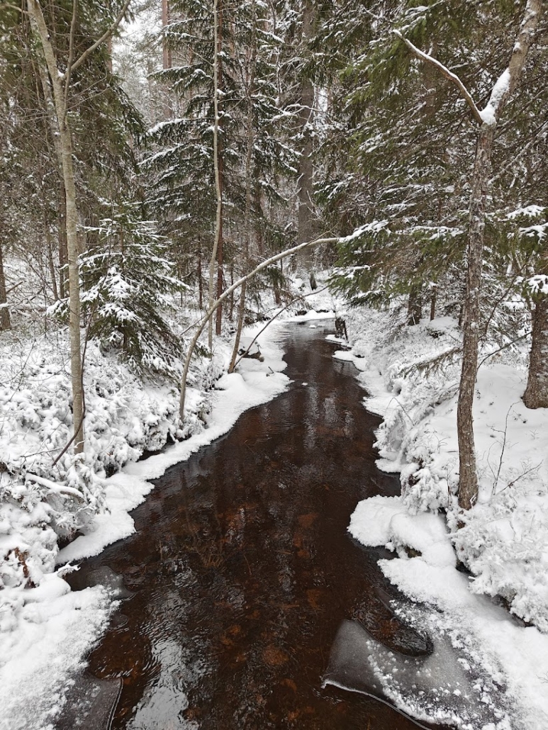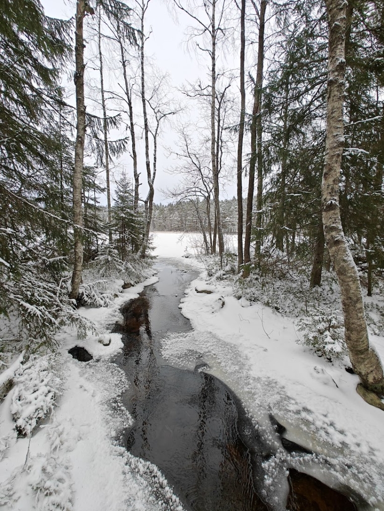 Before long, the trail led us to the shore of Myllylahti bay. At the junction, Kurjenpolku turned left, but I wanted to take a short look to the right to see a forest stream. On the map, the stream looked substantial enough that I suspected it might still be unfrozen – and indeed it was. It was lovely to stand on the bridge for a moment and watch the flowing water in both directions. Had we crossed the bridge and continued a short distance further, we would have reached the Myllylahti lean-to shelter, visible on the opposite shore of the bay.