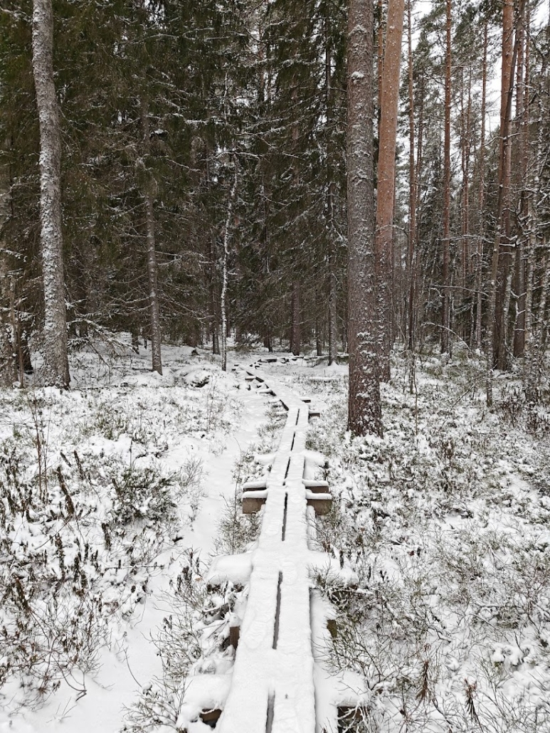 The route began on boardwalks, and continued as such for quite a while. Snow had covered the forest, and the boards were wrapped in a soft white blanket as well, so instead of clattering footsteps we made only gentle swishing sounds, quickly swallowed by the wind rustling through the trees. The temperature was just –11°C, but the wind made the air biting cold. My own mittens were nowhere near warm enough; my partner had chosen more wisely and was wearing thick, windproof winter mitts.