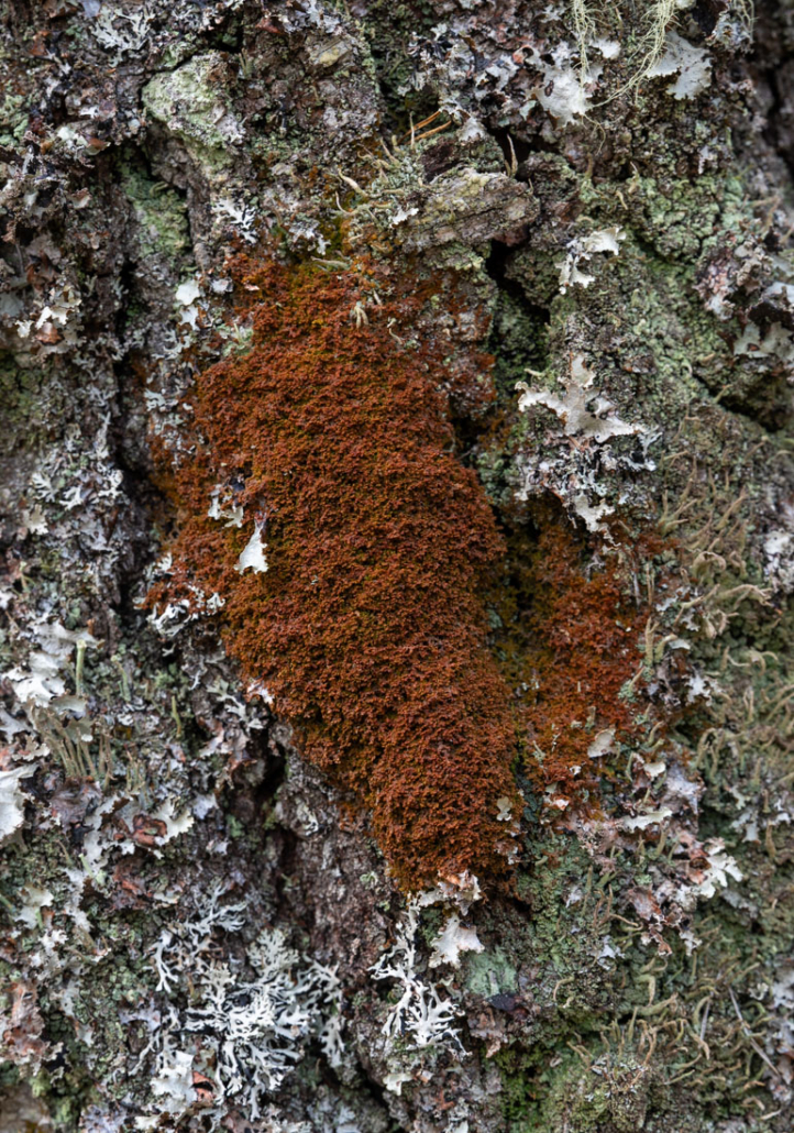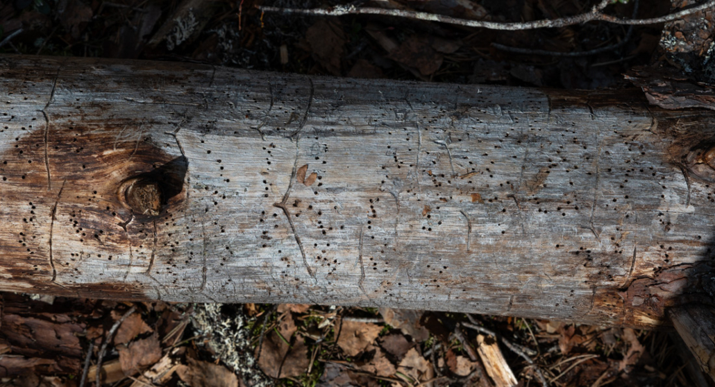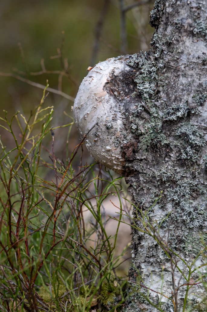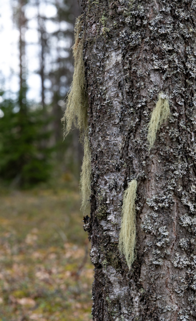 Walking back along the way I came, I soon rejoin Terassikierros. By the path, I see an old birch tree draped with tufts of beard lichen. Tree fringewort (Ptilidium pulcherrimum) grows on another. On an old trunk on the ground, the holes and tunnels of beetle and their larvae have been exposed. All of these show the age and natural state of the forest.