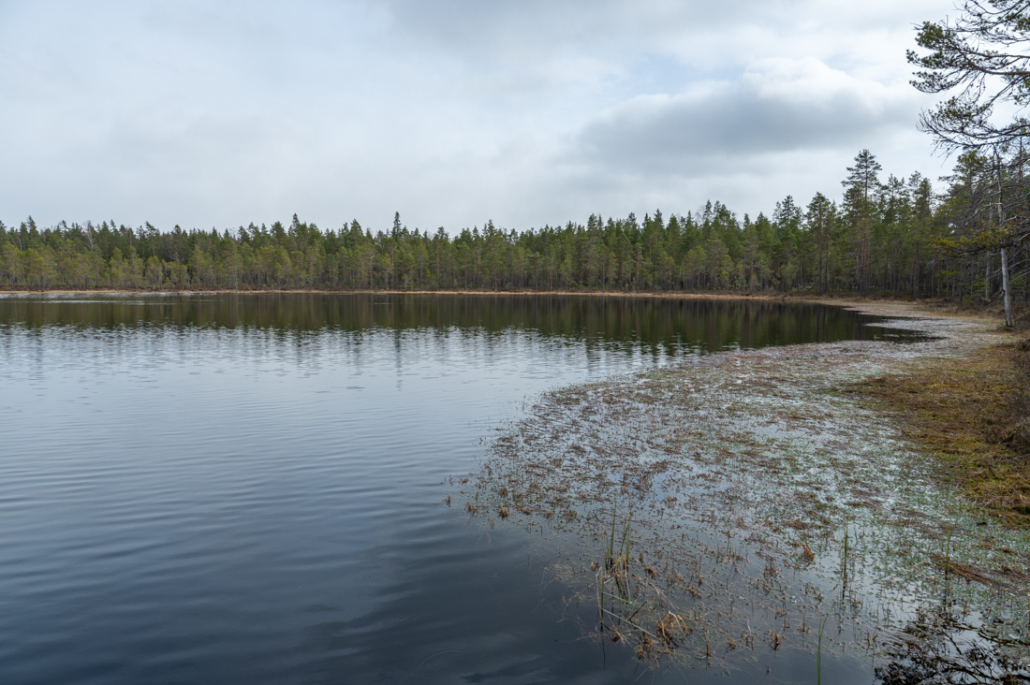 Before I reach the bottom, the path splits into two. Rantapolku veers off to the right, back up the hill. Terassikierros continues downwards and straight ahead. Walking is easy as the ground flattens out. I pass through the forest at steady, easy pace, I’m in no rush. The air is fresh, the scent of reawakening after winter invigorating, and daylight lasts for many hours yet. In early spring, bird life is quiet after the morning redstart concert. Through the trees I can see Kärkikeidas, a bog another part of the diversity within the national park
