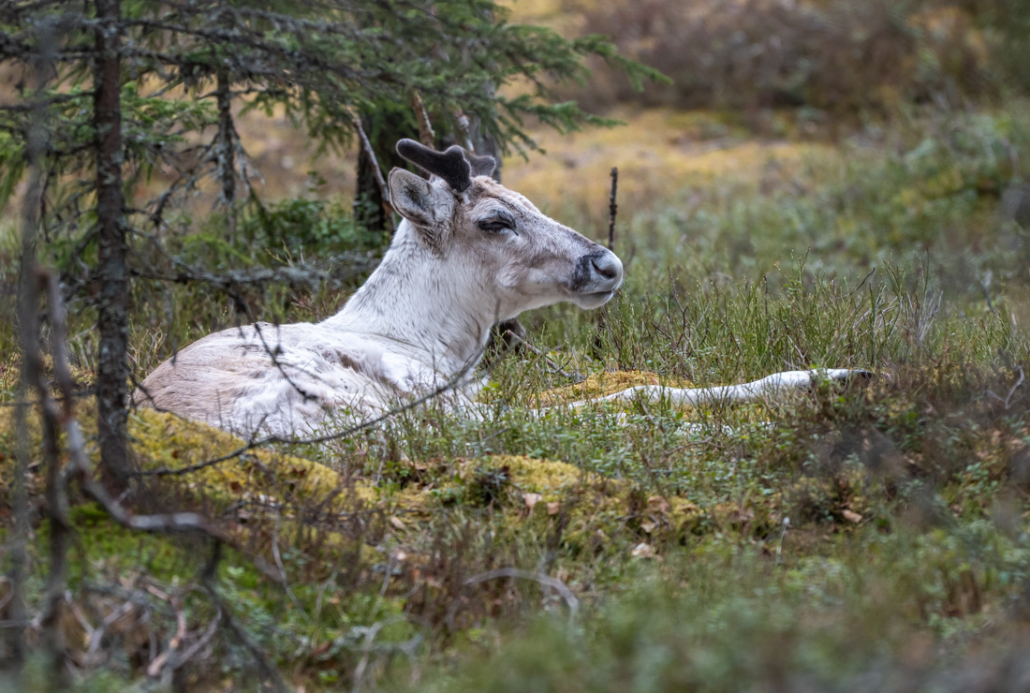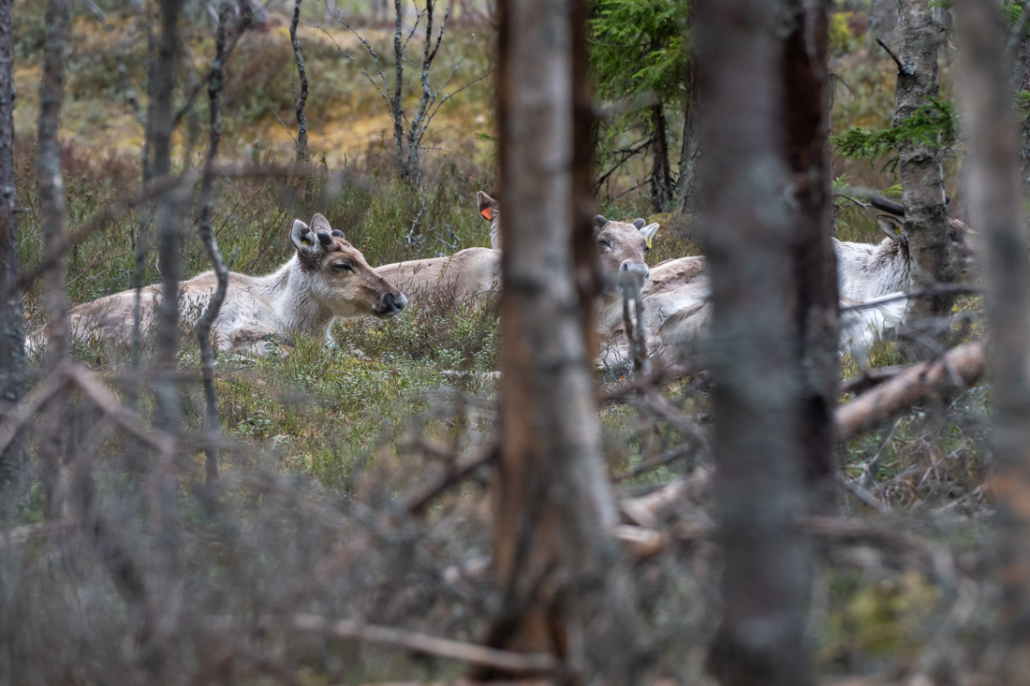 I follow the fence to the right to walk around the enclosure in an anticlockwise direction. Thankfully, I don’t need to walk far before I spot one between the trees. Soon, I spot more. I count them. All the youngsters are resting together, either sleeping or chewing the cud. A couple of them raise their heads to look towards me. I wonder if they recognise me, this being my third visit to see them. Each one has a different coloured ear tag, so they can be recognised after release. For a few precious moments, I enjoy their company. Finland’s own reindeer is a beautiful, interesting animal. As this is my last visit, I wish them well and a long life, and to be wary of hungry predators.