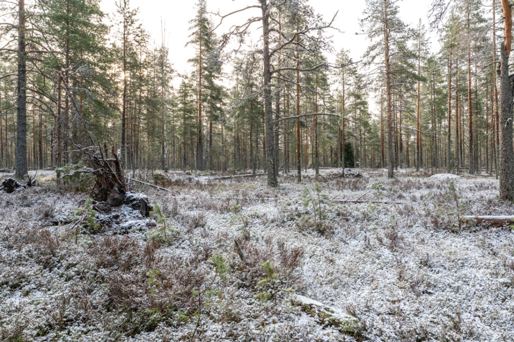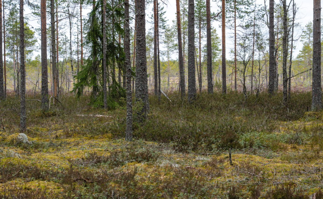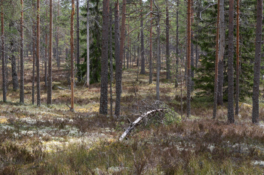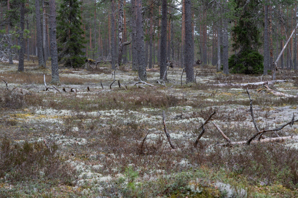 Further down the hill, the forest changes from lush mixed forest back to open pine forest. On the lower reaches, the soil is sandier, poorer and drier. Pines can grow, so can the odd birch and very sparsely a small spruce or two. The undergrowth is short, mostly low lingonberry and bilberry bushes, interspersed with bright patches of reindeer lichen and moss.