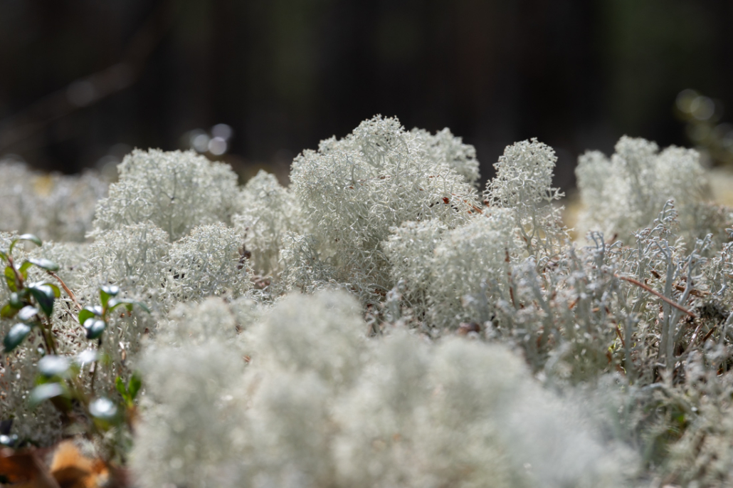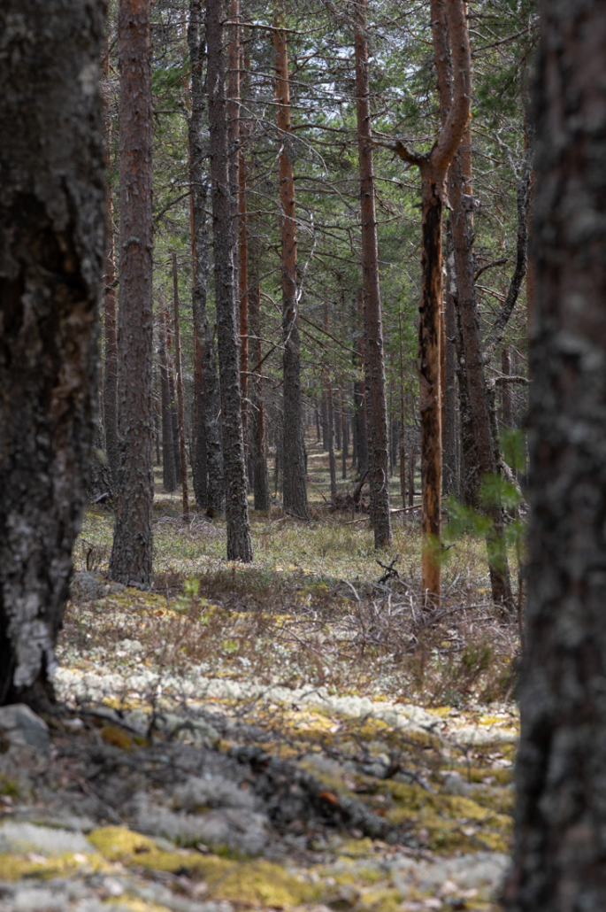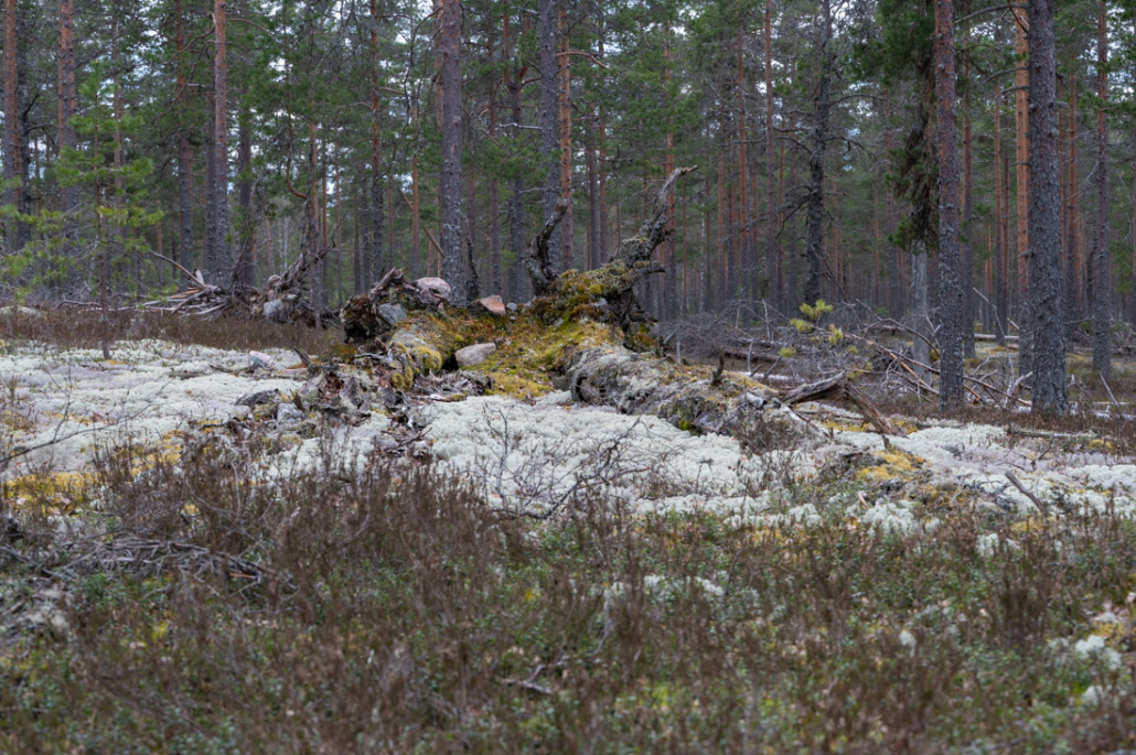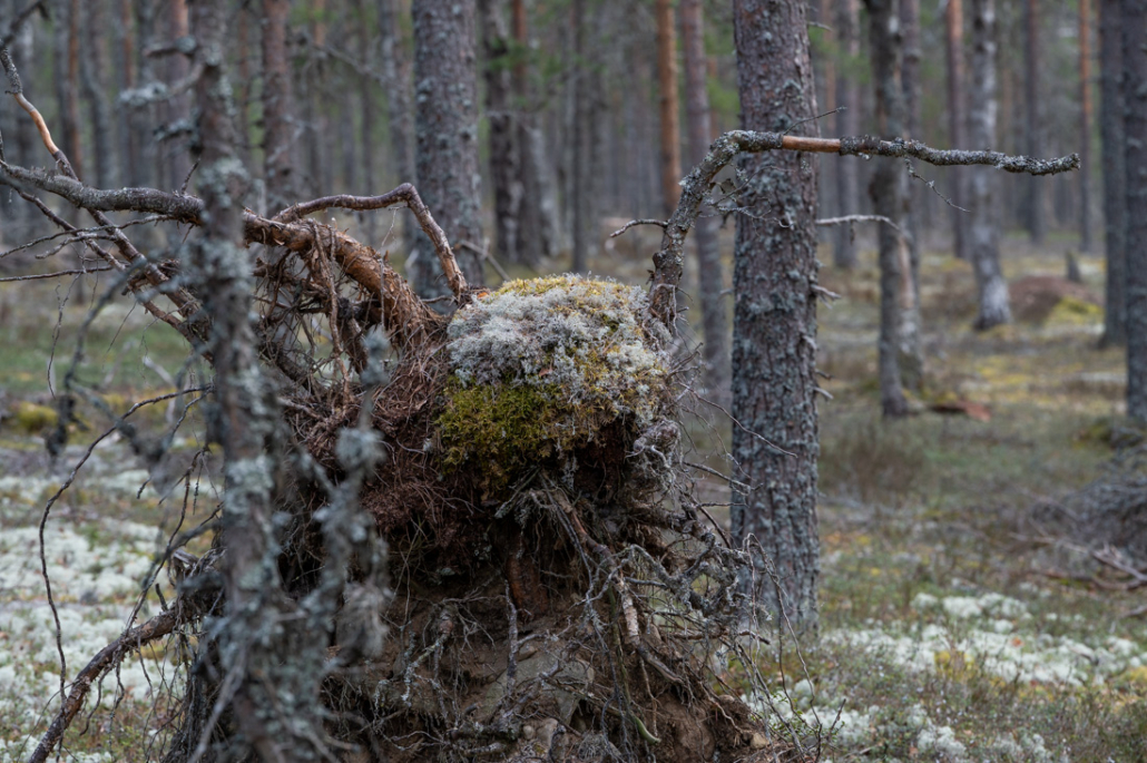 Fallen, slowly rotting and decaying trees break up the landscape. Their roots point skywards, forming shapes and figures that kindle my imagination. One resembles the outstretched arms of a giant, another the handlebars of a motorcycle, or perhaps the antennae of a sleeping giant insect. Looking closely into reindeer lichen, I see a miniature forest within a forest. Who or what walk between these trunks and dense branches? They cannot be very tall that is for sure.