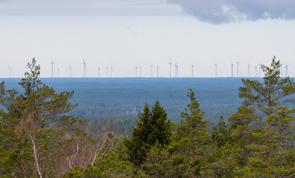 I climb the many steps to the top of the tower. It is a comfortable ascent, the slatted walls of the tower providing suitable shelter from the wind. On reaching the top, the biting wind reminds me that today is an early spring day. Looking out from the tower, all I see at first is forest, nothing but trees stretching as far as the eye can see. On the horizon though, is a different sight. Wind turbines rise out of the landscape, dwarfing the trees. I scan round and walk to each side, each corner, everywhere I see giant wind turbines. In some directions less, even gaps, in others it is like seeing a wall of slowly turning blades.