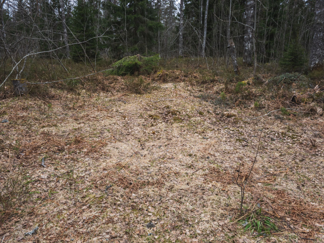 Back on ground level, I follow the trail again. At this point Terassikierros follows the same path as Rantapolku, a trail that loops around the summit of Lauhanvuori. Slowly I descend, passing an old potato patch, where in past times the people living here grew potatoes. The fertile soil and low frost risk made the hilltop a great place for small-scale farming. The patch was cleared of shrubs in 1988; others are overgrown with just a few moss-covered stones remaining.